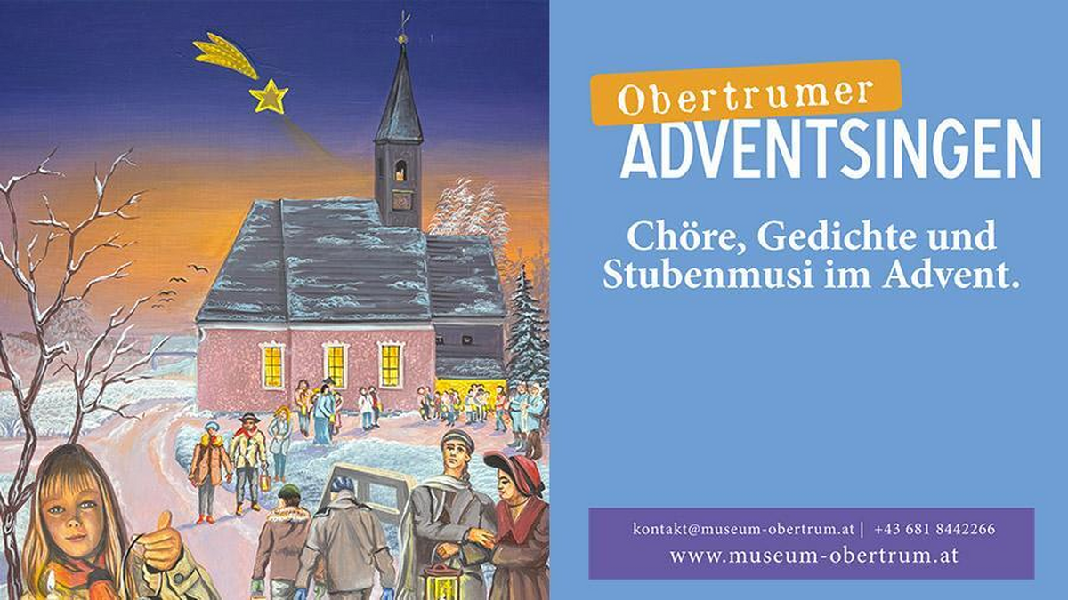 Obertrumer Adventsingen – Chöre, Gedichte und Stubenmusi im Advent Im Salzburger Land gehört das Adventsingen zur Vorweihnachtszeit, wie der Badespaß an den schönen Seen. Das Obertrumer Adventsingen und das Tobi Reiser Adventsingen haben inhaltlich nichts miteinander zu tun, aber beiden stimmen ihre Besucherinnen und Besucher auf die besinnliche Weihnachtszeit ein. Nähere Details zum Programm wird noch bekannt gegeben.Abendkassa: € 28,00 pro Person Vorverkauf: € 25,00 pro Person (Karten sind während des Adventmarktes im Museum verfügbar, solange der Vorrat reicht)www.museum-obertrum.at