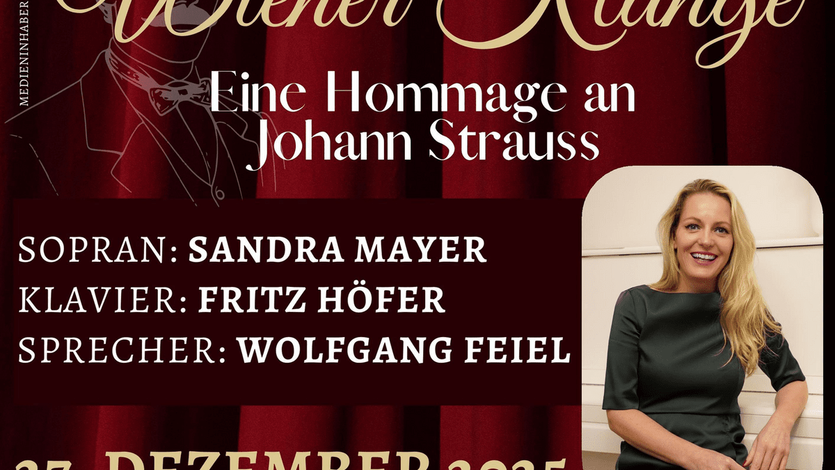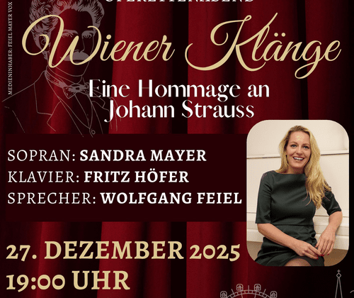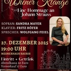 Wiener Klänge - Eine Hommage an Johann Strauss. Präsentiert von: Sopran Sandra Mayer, Klavier Fritz Höfer, Sprecher Wolfgang Feiel. Eintritt plus Getränk: Abendkassa 20,- / Vorverkauf 17,- - erhältlich im Mesnerhaus +43 664 19 16 301 oder im Tourismusbüro Rauris +43 6544 200 22