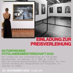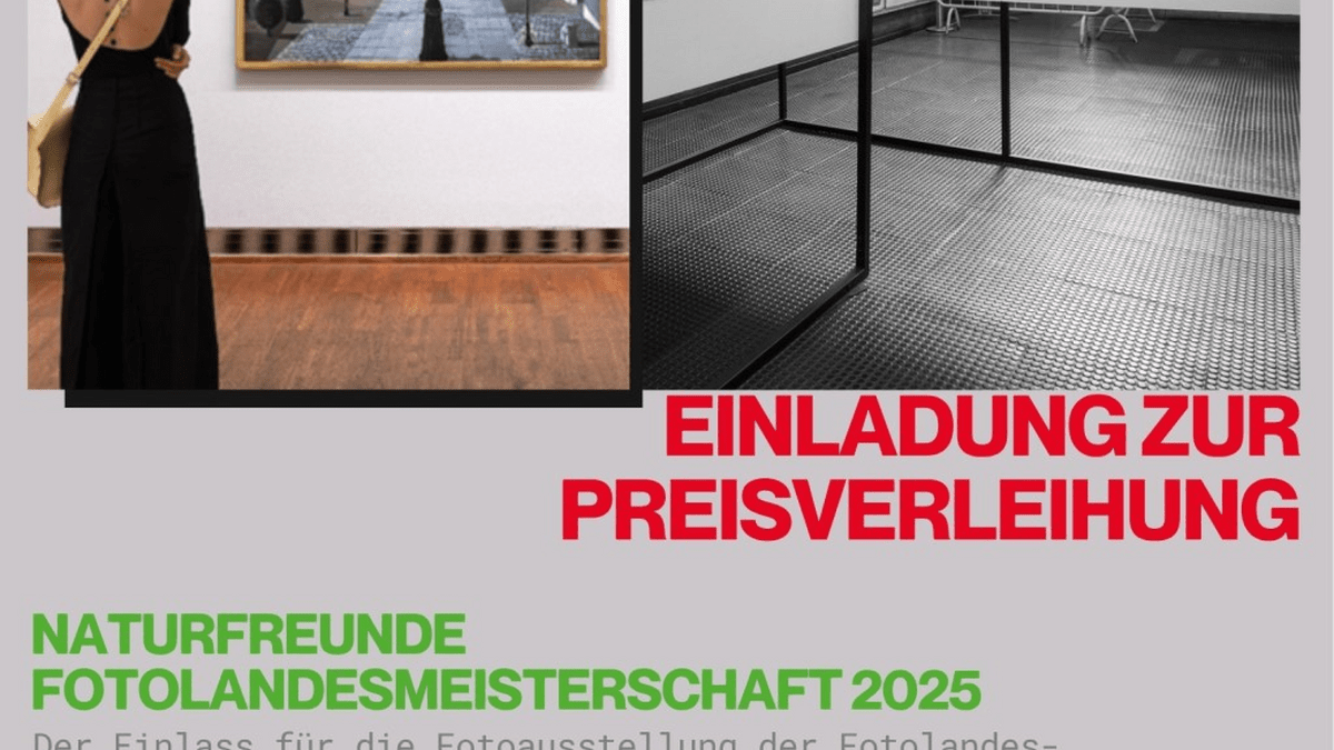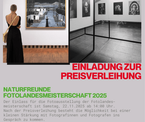 Der Einlass für die Fotoausstellung der Fotolandesmeisterschaft ist Samstag, 22.11.2925 ab 14:00 Uhr. Nach der Preisverleihung besteht die Möglichkeit bei einer kleinen Stärkung mit Fotografinnen und Fotografen ins Gespräch zu kommen.
