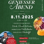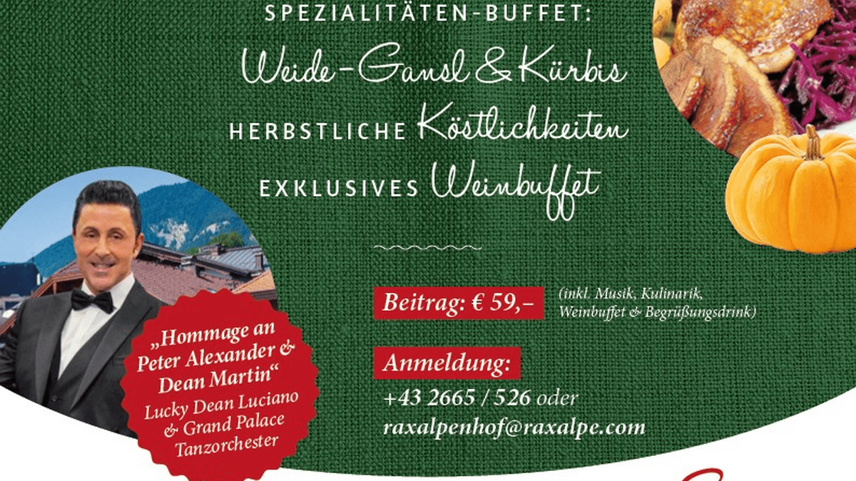 Gönne dir eine Auszeit vom Alltag – genieße mit allen Sinnen, plaudere in entspannter Atmosphäre und lass’ dich kulinarisch wie musikalisch verwöhnen. Im Mittelpunkt des Abends steht der Herbst mit seinen vielfältigen, saisonalen Genüssen. Ob Fleischliebhaber oder Vegetarier – für jeden Geschmack ist gesorgt: Freue dich auf feine Spezialitäten von der Gans, Köstlichkeiten rund um den Kürbis, herzhafte Suppen, kalte Vorspeisen, raffinierte Herbstbeilagen, ein reichhaltiges Salatbuffet und eine exklusive Weinbar.
