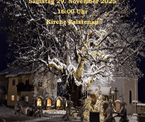 in der Pfarrkirche Faistenau, gestaltet vom Volksliedsingkreis Faistenau: „Weihnachtslieder schenken – Einstimmung in den Advent“, Sprecher: Don Rupi, freiwillige Spenden erbeten. Mit dabei sind auch noch der Männer Vier- und Frauen Dreigsang, Sonnleitn Dreigsang und Stubenmusi.