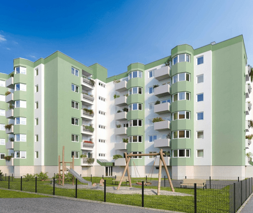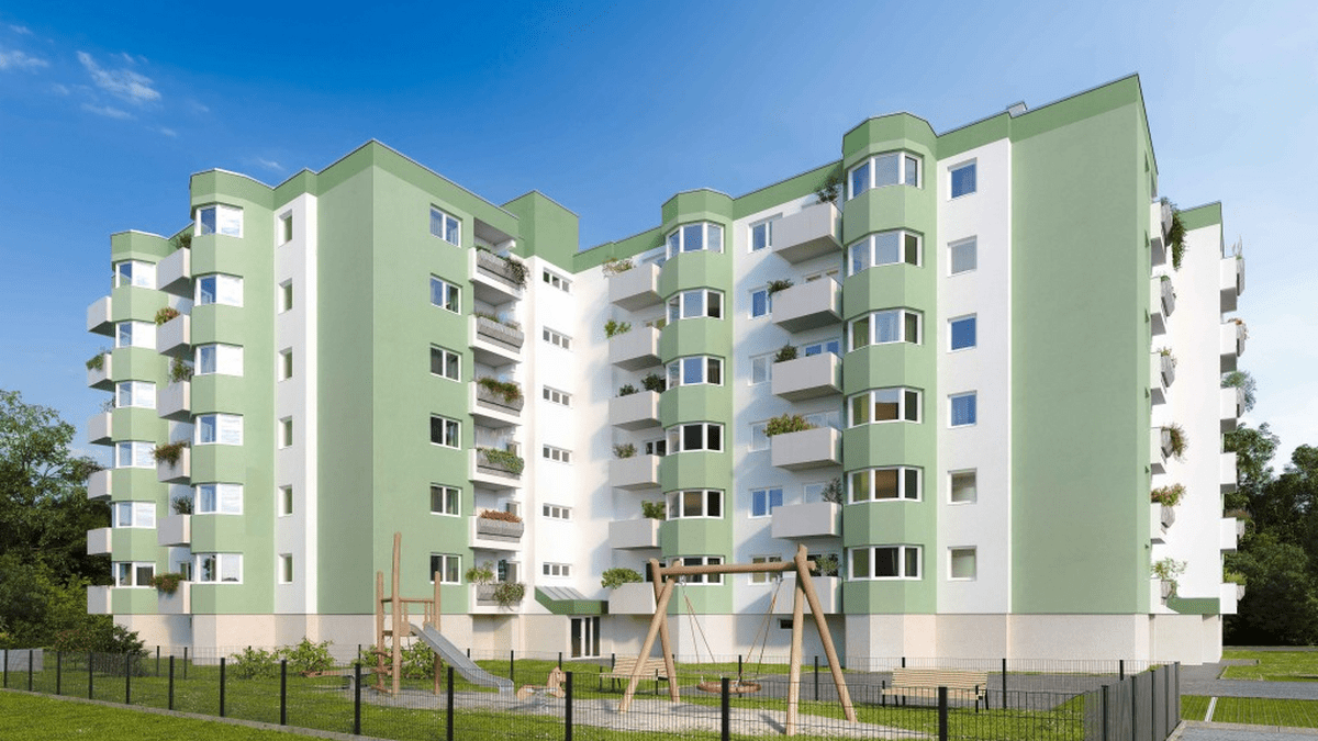 Die beiden Wohnhäuser der "Wien Süd" in der bekannten "Porschesiedlung" stammen aus dem Jahr 1993 und werden einer umfassenden ökologischen Totalsanierung unterzogen.