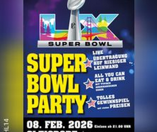 Ab 21:00 Uhr öffnen sich die Türen, um gemeinsam das größte Sportereignis der Welt, den legendären Super Bowl, live auf einer riesigen Leinwand zu erleben – mitreißend, spannend und in echter amerikanischer Atmosphäre.