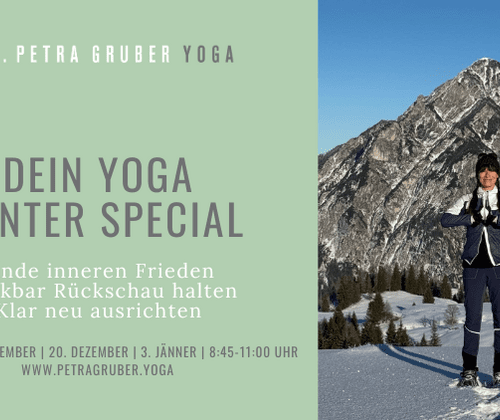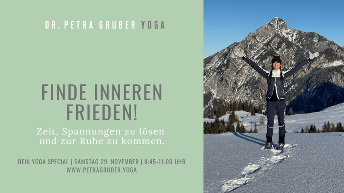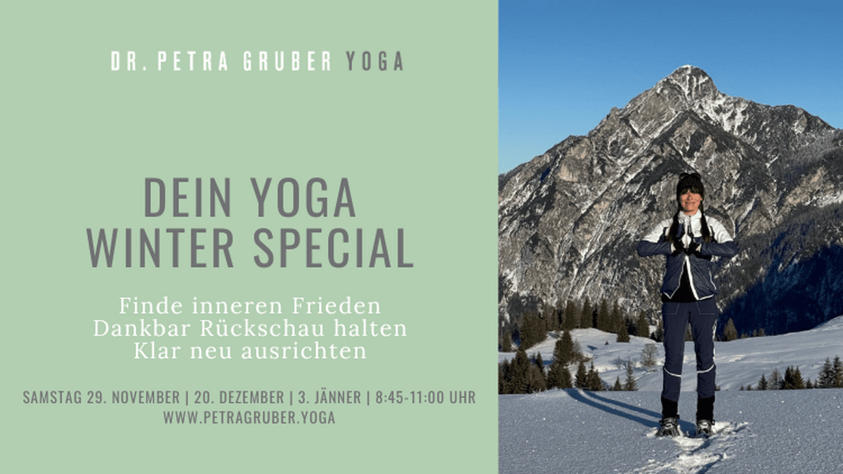 In der Stille liegt die Kraft – Dein Yoga Winterspecial mit Dr. Petra Gruber (Bad Ischl)Tauche ein in die wohltuende Stille des Winters und erlebe drei besondere Yoga-Vormittage im Einklang mit der Natur.Der Winter lädt uns ein, nach innen zu lauschen, unserer inneren Weisheit und auch unseren Schatten zu begegnen – und neue Kraft zu sammeln.Inspiriert von den Yoga-Sutras und der Traditionellen Chinesischen Medizin (TCM) begleiten Dich harmonisch abgestimmte Körper- und Atemübungen, Meditation, Reflexion und praktische Impulse für Deinen Alltag durch die dunkle Jahreszeit.
