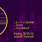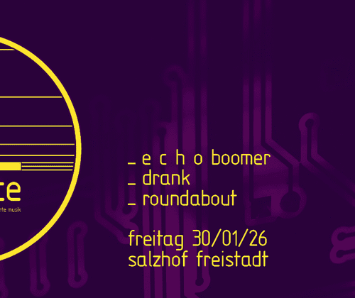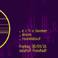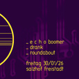 ROUNDABOUTE C H O BOOMERDie Band E C H O BOOMER spielt seit ihrer Gründung 2017 mit den Hörerwartungen ihres Publikums. Mal kammermusikalisch, mal elektronisch changiert die Musik am schmalen Grat der Einordenbarkeit. Die 7-köpfige-Band gewann 2024 den österreichischen Jazzpreis in der Kategorie „Bestes Album“.Das aktuelle Album The Shape Of Things That Never Came geht den begonnen Weg weiter, verfeinert jedoch die Klangsprache des Ensembles um vielerlei Nuancen. Durch den immer loser werdenden Umgang mit dem musikalischen Material aus der Feder der Bassistin und Bandleaderin Beate Wiesinger kommen nun die individuellen musikalischen Stimmen dieses „Solist*innen-Ensembles“ noch mehr zur Geltung.Im Kern entspringt diese Idee der langen Tradition des Jazz, „E C H O BOOMER“ formulieren jedoch einen sehr eigenständigen und unverkennbaren Gedanken zu dieser Musik und bedienen sich am Weg unterschiedlichster stilistischer Elemente: ein Amalgam aus Popmusik, Noise und neuer Musik begegnet der wohlgestimmten Hörerin und lässt die Musik so zu einem ungehörten Sammelsurium an Einflüssen und Stilistiken werden.Durch die Verquickung von musikalischer Freiheit und auskomponiertem Kontext entsteht so – im Spannungsfeld zwischen Komposition und Improvisation – der Ensembleklang, der „E C H O BOOMER“ ausmacht.Die Musik schlängelt sich durch Erwartungen, Ankündigungen und Traditionen, bedient sich überall und manchmal nirgends, folgt jedoch ihrer eigenen Logik und Regeln, die im gemeinsamen Prozess des Erarbeitens und Probens des Materials entstanden sind.Astrid Wiesinger – saxophone & voice