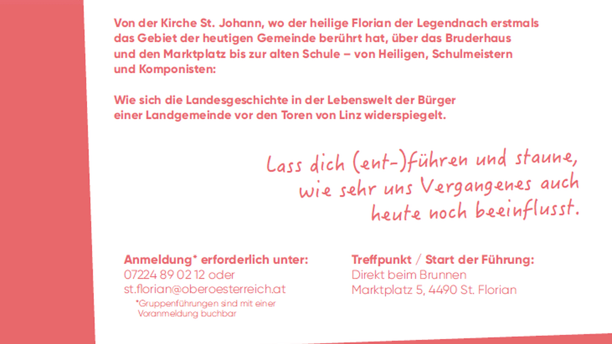 Von der Kirche St. Johann, wo der heilige Florian der Legende nach erstmals das Gebiet der heutigen Gemeinde berührt hat, über das Bruderhaus und den Marktplatz bis zur alten Schule – von Heiligen, Schulmeistern und Komponisten: Wie sich die Landesgeschichte in der Lebenswelt der Bürger einer Landgemeinde vor den Toren von Linz widerspiegelt.