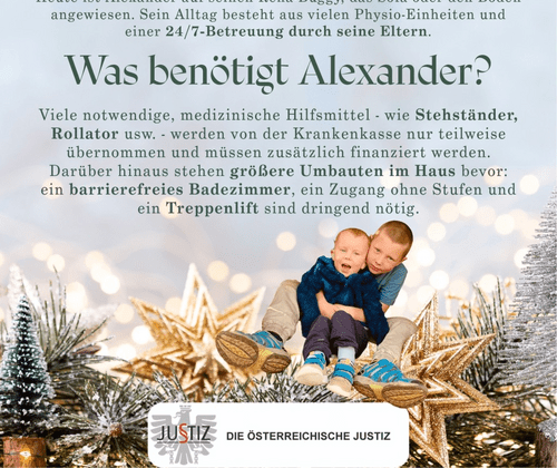 In diesem Jahr wollen wir Alexander und seine Familie unterstützen. Alexander kam 2021 als gesunder Bub zur Welt, leidet aber an der sehr seltenen Erkrankung VAC14, die zu einem fortschreitenden Abbau seiner motorischen Fähigkeiten führt.