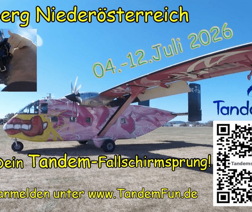 Jedes Jahr findet in Fromberg bei Kirchberg am Walde das legendäre Fallschirmspringertreffen (Pink Boogie) statt. Von 04.-12.07.2026 bieten wir von Tandemfun wieder täglich Tandemsprünge aus 4300m an.