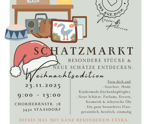 Am 23. November 2025 verwandelt sich die Chorherrnstraße 78 in Staasdorf erneut in einen liebevoll gestalteten Schatzmarkt voller Lieblingsstücke, Überraschungen und weihnachtlicher Highlights.