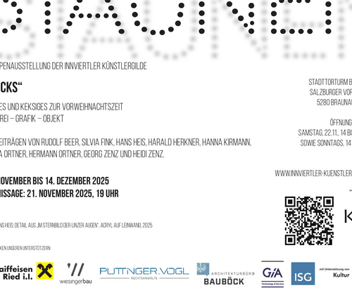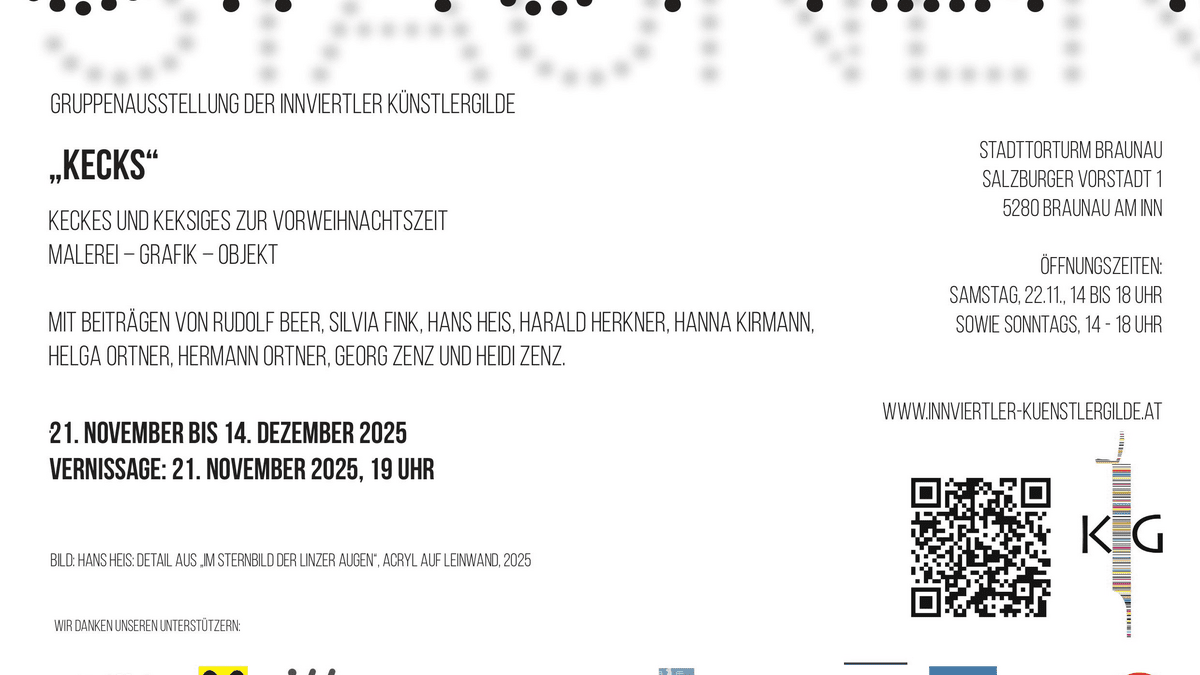 Gruppenausstellung der Innviertler Künstlergilde "Kecks" Keckes und Keksiges zur Vorweihnachtszeit Malerei – Grafik – Objekt Mit Beiträgen von Rudolf Beer, Silvia Fink, Hans Heis, Harald Herkner, Hanna Kirmann, Helga Ortner, Hermann Ortner, Georg Zenz und Heidi Zenz. 21. November bis 14. Dezember 2025 Vernissage: 21. November 2025, 19 Uhr