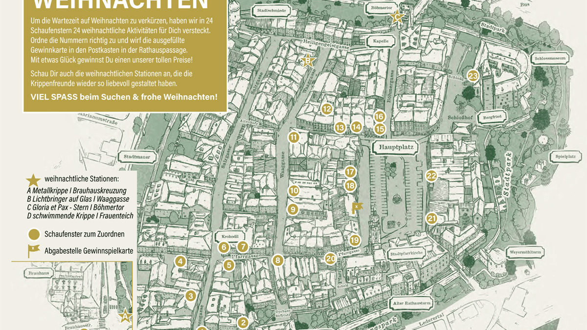 Auch heuer gibt es wieder eine Rätselrallye durch die Stadt, um die Wartezeit auf Weihnachten zu verkürzen oder sich in den Weihnachtsferien die Zeit zu vertreiben: in 24 Schaufenstern sollen 24 weihnachtliche Aktivitäten richtig zugeordnet werden. Dabei gibt es 10 Preise zu gewinnen, der Hauptpreis ist ein Gratis-Zugang für das neue Outdoor-Escape-Game. Der Plan ist online sowie in der Rathauspassage und den teilnehmenden Betrieben erhältlich.