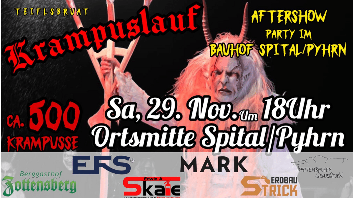 Begleitet von einem dumpfen Grollen, mystischen Klängen und tosendem Glockengeläut, ziehen ca. 500 Krampusse und Perchten durch Spital am Pyhrn. Durch die frühe Finsternis des Winters erhält die Veranstaltung, die dem Brauch nach das Böse fernhalten soll, eine besondere Note. Das Großaufgebot der Krampusse und Perchten, die viele Stunden damit verbracht haben, ihre kunstvoll gestalteten, furchteinflößenden Masken, zotteligen Kostüme sowie Wägen und Käfige vorzubereiten, lassen dem ein oder anderen Zuseher einen kalten Schauer über den Rücken laufen. Für innerliche Wärme sorgen Glühmost, Kinderpunsch & Co.