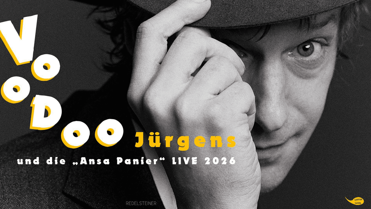 Voodoo Jürgens & die Ansa Panier präsentieren sich 2026, rechtzeitig zum zehnjährigen Jubiläum als Live-Band revitalisiert und runderneuert. Man munkelt Voodoo habe hoch im deutschen Norden an neuem Material gearbeitet, dort wo einst Heintje schon seine „Mama“ besang.Die ersten drei Voodoo-Alben „Ansa Woar“, „`s klane Glücksspiel“ und „Wie die Nocht noch jung wor“ sind allesamt bereits verdiente Klassiker des österreichischen Pops, und gleichermaßen bilden sie eine Art Sturm & Drang-Triologie des frühen Voodoo.Nun mit Album vier steht eine Frischzellenkur des Sounds an; ein Aufbruch in Sound und Vision.Auch die lyrische Palette soll dafür erweitert werden, das Beisl für die große Welt da draußen, sowie die kleine Welt da drinnen, jene in der eigenen Seele, verlassen werden. Die Band spürt dass sie ihr bestes Album, ihren größten Wurf in petto hat, und so kann man sich auch einiges von Voodoo und seiner Ansa Panier live anno 2026 erwarten. Treten Sie hervor, kommen Sie vorbei, hören Sie gut zu, schauen Sie sich das an!