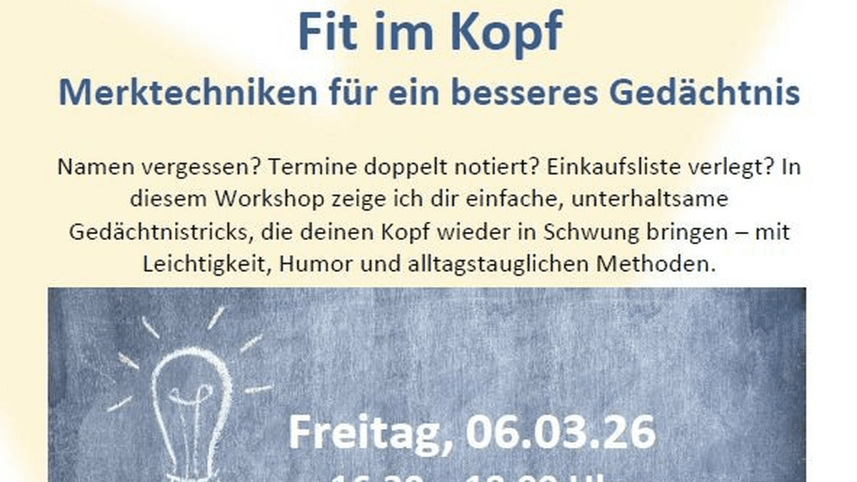 Namen vergessen? Termine doppelt notiert? Einkaufsliste verlegt? In diesem Workshop zeige ich dir einfache, unterhaltsame Gedächtnistricks, die deinen Kopf wieder in Schwung bringen – mit Leichtigkeit, Humor und alltagstauglichen Methoden.