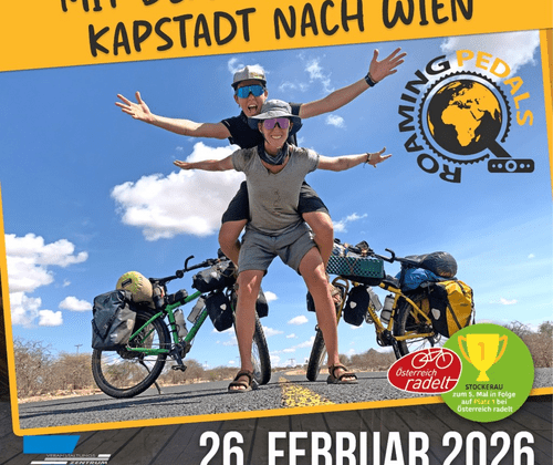 Erleben Sie eine außergewöhnliche Abenteuergeschichte voller Energie, Mut und unvergesslicher Begegnungen! Die „Roaming Pedals“ nehmen Sie in ihrer Live-Reportage mit auf eine beeindruckende Reise quer über den afrikanischen Kontinent – von Kapstadt bis nach Wien, ausschließlich mit dem Fahrrad.