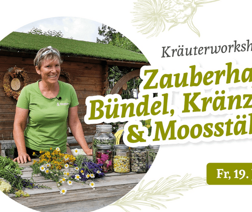 In diesem liebevoll gestalteten Workshop zeigt Ihnen unsere Kräuterexpertin Andrea, wie Sie aus frischen Kräutern, duftendem Moos und Blüten kleine Kunstwerke entstehen lassen – Kräuterbündel, Kränzchen oder Kräutermoosstäbe.