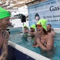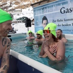 Die Teilnehmer*innen wagen sich bei Minustemperaturen nur leicht bekleidet auf Langlaufskiern durch die Winterlandschaft, bevor sie sich in ein Eisbad begeben.
