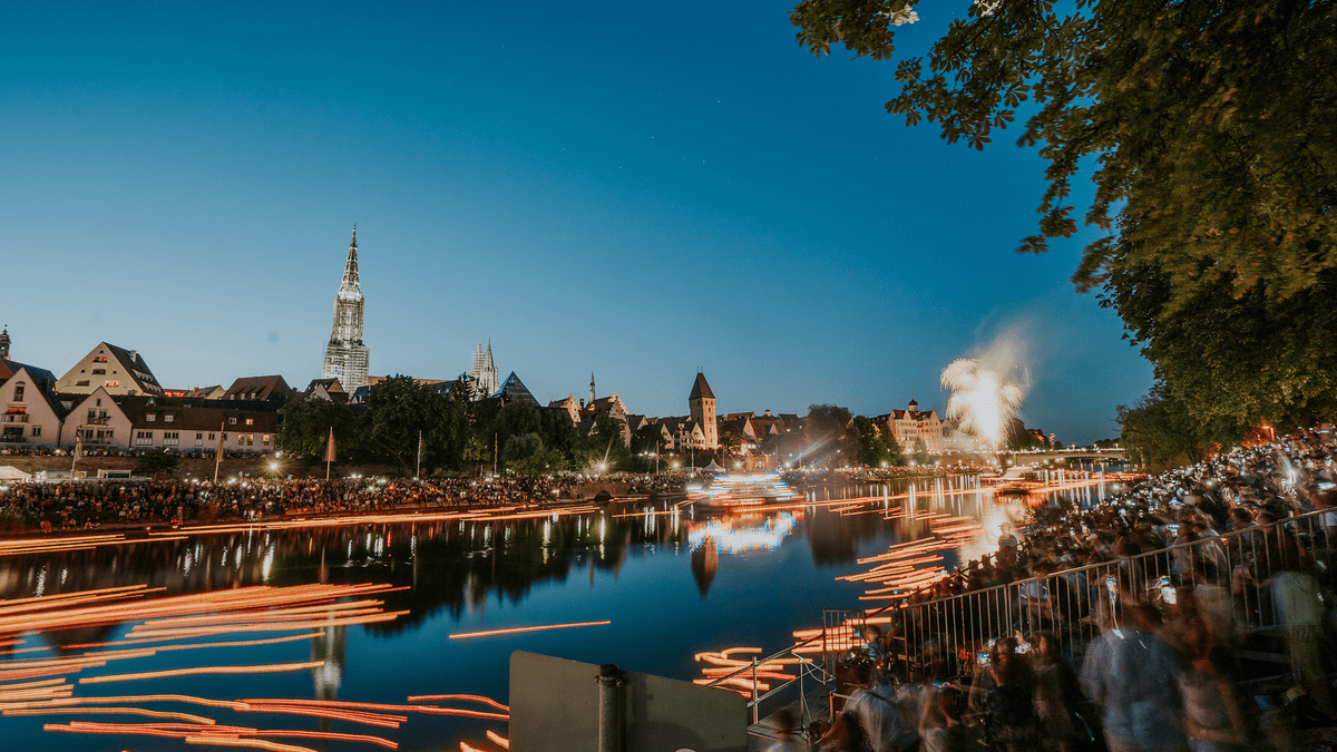 Die Lichterserenade gehört seit Jahrzehnten zur Schwörwoche in **Ulm**. Tausende rote Teelichter treiben am Abend über die Donau und markieren einen ruhigen, traditionsreichen Moment im Ulmer Veranstaltungskalender. Seit mehr als 50 Jahren ist die Lichterserenade fester Bestandteil der Ulmer Schwörwoche. Sie findet immer am Samstag vor dem Schwörmontag statt, der auf den vorletzten Montag im Juli fällt. Bei Einbruch der Dunkelheit werden über 20.000 rote Teelichter am Beginn der Altstadt auf der **Donau** ausgesetzt und außerhalb des Stadtgebiets wieder eingesammelt. Die Länge der Lichterserenade richtet sich nach der Fließgeschwindigkeit der Donau und variiert daher von Jahr zu Jahr. Entlang der Ufer versammeln sich zahlreiche Menschen, um das Vorüberziehen der Lichter zu verfolgen. Das Ereignis lebt nicht von Inszenierung, sondern von Wiederholung und Ruhe – gerade das macht seinen besonderen Reiz aus. Als Auftakt zur Schwörwoche ergänzt die Lichterserenade die weiteren traditionellen Veranstaltungen rund um den Schwörmontag und das Nabada. Sie verbindet Stadtgeschichte mit dem öffentlichen Raum an der Donau und ist ein Beispiel dafür, wie Traditionen in Ulm bis heute selbstverständlich gelebt werden.