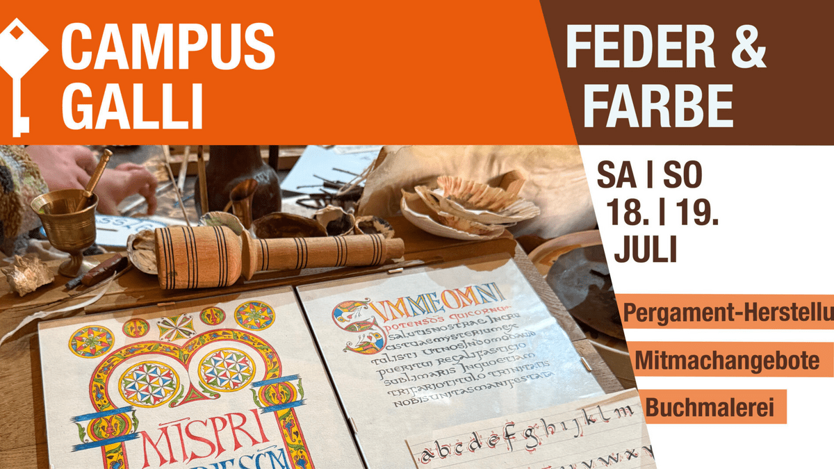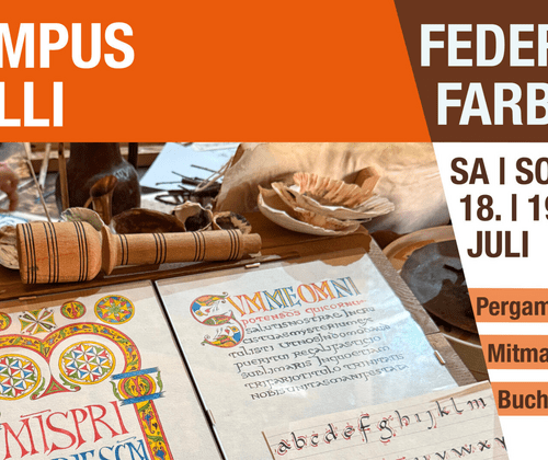 Im frühen Mittelalter war die Schrift nicht nur ein Mittel zur Kommunikation – Schreiben und Malen war auch eine hoch angesehene Kunst. Mönche bewahrten und vervielfältigten Wissen, indem sie in mühsamer Handarbeit Bücher aus Pergament, also speziell bearbeiteter Tierhaut, fertigten und aufwendig per Hand beschrieben und gestalteten. Dies geschah in den Skriptorien, den Schreibstuben der Klöster. Sie waren nicht nur Orte der Gelehrsamkeit, sondern auch Werkstätten, in denen durch kunstvolle Verzierungen aus einfachen Texten prachtvolle Werke wurden. Auch im St. Galler Klosterplan, nach dem auf CAMPUS GALLI gebaut wird, findet man eine Schreibstube. Während dieses Themenwochenendes können Sie auf CAMPUS GALLI die Buchherstellung des Mittelalters mitverfolgen: - Pergamentherstellung – Sehen Sie, wie Tierhäute zu robustem Pergament verarbeitet werden. - Buchbinden – Sehen Sie zu, wie Bücher historisch gebunden wurden. - Kalligraphie – Lassen Sie sich von der kunstvollen Ausführung historischer Schriften faszinieren. - Buchmalerei –Buchmalerinnen demonstrieren die aufwendige Gestaltung von Handschriften mit leuchtenden Farben und kunstvollen Initialen. Auch Sie können sich in die Welt des mittelalterlichen Malens und Schreibens vertiefen und eigene Erfahrungen sammeln: Probieren Sie die karolingische Minuskel in eine Wachstafel zu ritzen oder schreiben Sie sie mit einem Federkiel bzw. Schilfrohr und Tinte. Außerdem können Sie an diesem Wochenende Ihr eigenes, kleines Buch binden oder ein Lesezeichen mit farbenfrohen Ornamenten oder Initialen gestalten.