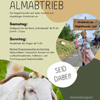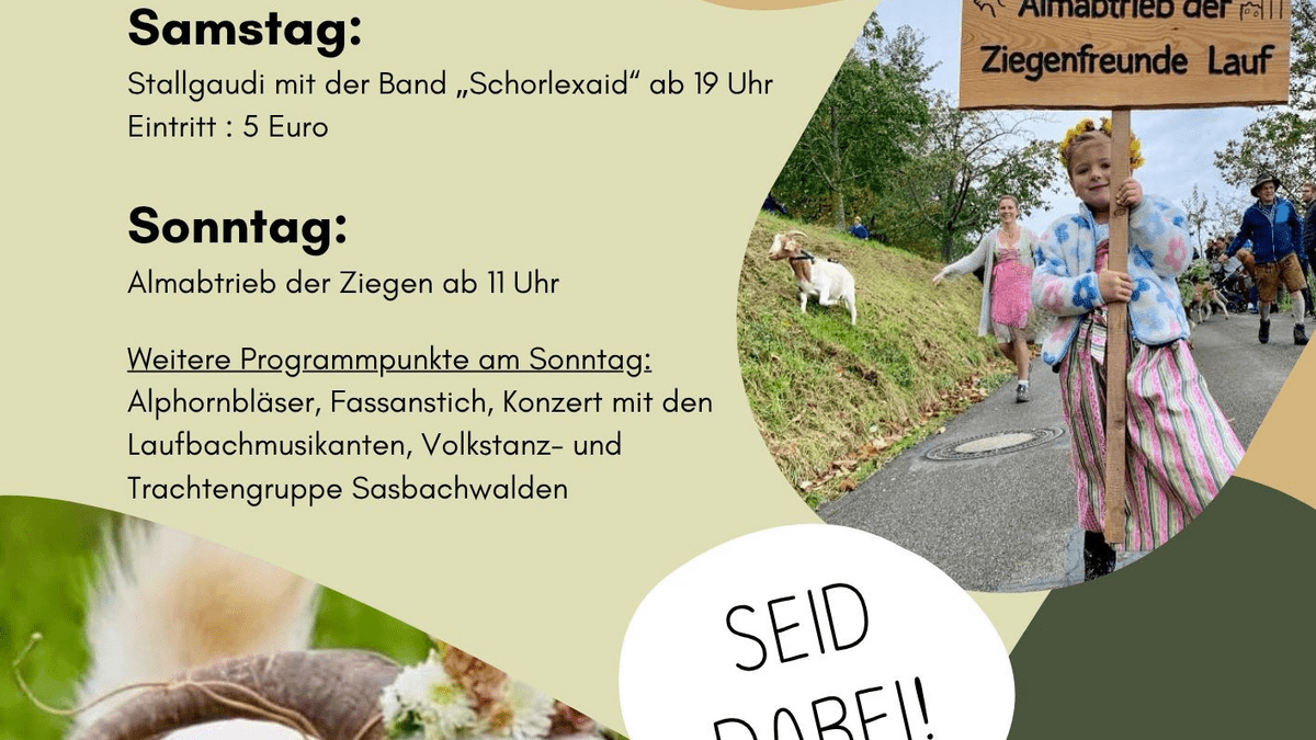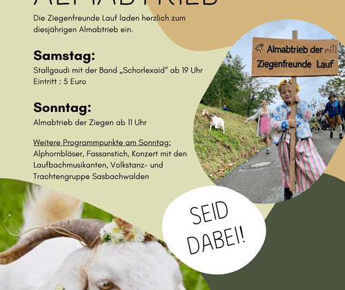 Die Ziegenfreunde Lauf laden herzlich zum diesjährigen Almabtrieb ein. Samstag: Stallgaudi mit der Band "Schorlexaid" ab 19 Uhr. Eintritt 5 €. Sonntag: Almabtrieb der Ziegen ab 11 Uhr. Weitere Programmpunkte am Sonntag: Alphornbläser, Fassanstich, Konzert mit den Laufbachmusikanten, Volkstanz- und Trachtengruppe Sasbachwalden.