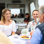 Rundfahrt entlang des Ufers der Bregenzer Bucht Von Lindau aus starten wir entlang dem deutschen Ufer Richtung Bregenz. Wir überqueren die deutsch-österreichische Landesgrenze und befinden uns nun in der Bregenzer Bucht. Am Pfänderrücken entlang geht es vorbei an der berühmten Bregenzer Seebühne und dem Kloster Mehrerau . Zurück zur deutschen Seite fahren wir durch den Obersee und genießen die Weite und den Ausblick von Deck. Bitte beachten Sie, dass es aufgrund des eingesetzten Schiffs nicht möglich ist, Rollstühle bei den Panoramafahrten und Rundfahrten in der Bregenzer Bucht zu befördern.