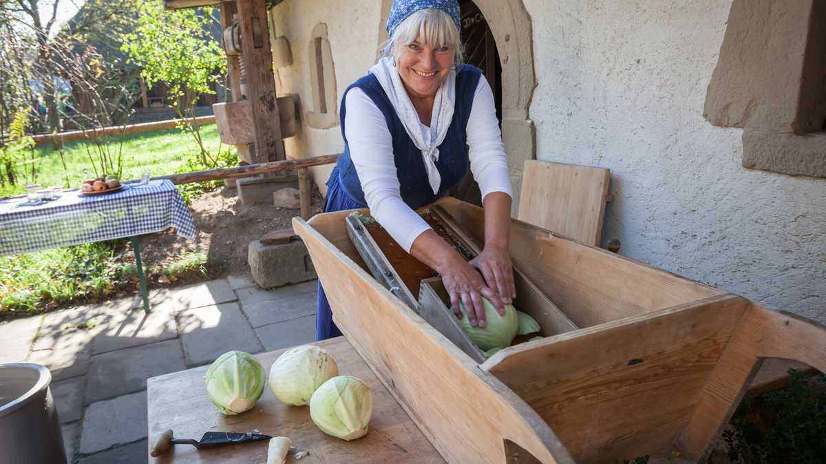 Herbst- und Schlachtfest im Vogtsbauernhof Herbst- und Schlachtfest ab 11 Uhr Frische Schlachtplatte Stilecht und geschmackvoll läuten wir die kalte Jahreszeit ein und laden zur Schlachtplatte in die gemütliche Stube im Falkenhof ein. Ort: Stube im Falkenhof, Nr. 6 14 Uhr bis 17 Uhr Akkordeonmusik Mit seinem Akkordeon weiß der Steinacher Henry Diener rund um den Falkenhof für Stimmung zu sorgen. Ort: Falkenhof, Nr. 6 11 bis 16 Uhr (letzter Beginn: 15 Uhr) Zeit für Rübengeister Als Halloween noch ein Fremdwort war, haben Kinder hierzulande schon Geister aus Futterrüben geschnitzt. Da knüpfen wir mit euch an alte Traditionen an. Ort: Vordach Falkenhof, Nr. 6 11 bis 17 Uhr Handwerksvorführungen Spinner Ort: Hippenseppenhof, Nr. 1 Traditionelle Vorratshaltung Ort: Küche im Tagelöhnerhaus, Nr. 4 Korbflechter Ort: Vogtsbauernhof, Nr. 8 Krauthobeln Ort: Kinzigtäler Speicher, Nr. 14 Moststation Ort: Lorenzenhof, Nr. 15 19 Uhr (Einlass: 18.30 Uhr) Lichtstube Mit Gitarre und einem abwechslungsreichen Repertoire eigener Lieder sorgt der Freiburger Musiker Uwe Sayer für einen stimmungsvollen Abend. Aufgrund der begrenzten Sitzplätze wird um Voranmeldung unter Telefon 07831-4679 3500 gebeten. Die Lichtstube ist kostenfrei.