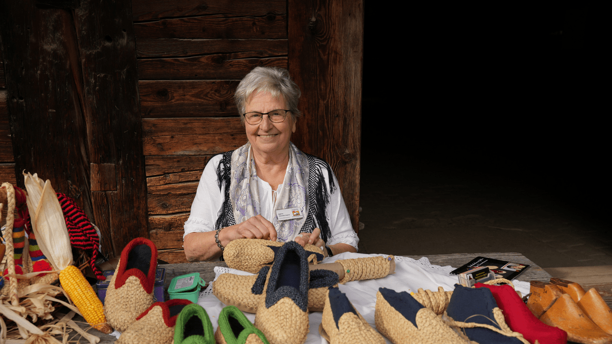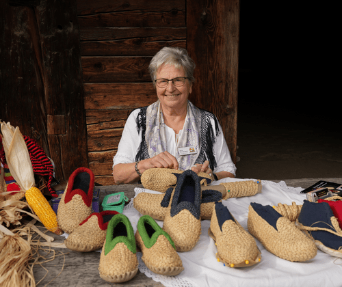 Handwerksvorführung: Strohschuhmacherin Handwerksvorführung: Strohschuhmacherin Die Strohschuhmacherin Agnes Zimmermann zeigt Ihnen gerne ihr Handwerk.