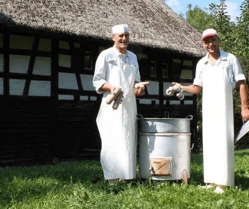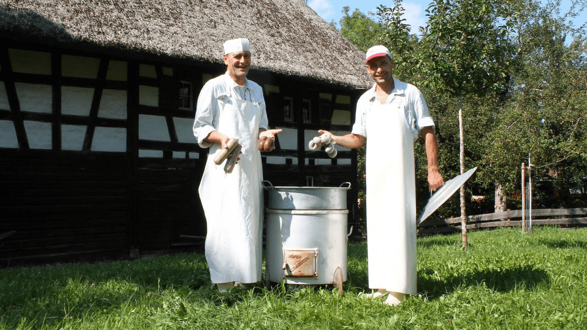 Genießen Sie Kesselfleisch und frische Würste, zubereitet wie bei der Hausschlachtung früher. Erleben Sie außerdem, welche Arbeiten in Haus und Hof im Herbst vor 100 Jahren üblich waren. Und die Kinder können bei der Kartoffelernte fleißig mithelfen. Herbstliches Handwerk Erleben Sie traditionelle Arbeiten wie Krauthobeln, Einmachen und Dreschen mit dem Flegel. Flachsbauern, Schmiede, Bürstenmacher sowie die Sattlerin und Weberin zeigen ihre Fertigkeiten. Sammeln Sie spannende Einblicke in die Kunst des Bierbrauens nach altem Rezept. Die historische Bandsäge und der Pferdegöpel sind in Aktion. Mitmachprogramm für Kinder Kinder können Kartoffeln im historischen Kartoffeldämpfer dämpfen und probieren. Ein Bastelprogramm sorgt für kreative Unterhaltung. Die Mini-Dampfbahnen des Schwäbischen Eisenbahnvereins e.V. lädt zu einer Rundfahrt ein. Projekt Im Rahmen des Kooperationsprojekts „1 qm Lein“ laden wir Projektteilnehmer ein, ihren selbst angebauten und geernteten Flachs heute gemeinsam mit den Flachsbauern Mettenberg zu brechen und zu bearbeiten. Informationen zum Projekt finden Sie auf https://1qmlein.de – Fragen zur Teilnahme in Kürnbach beantwortet Ihnen gerne Torsten Albinus ( torsten.albinus@biberach.de , 07351-526792 ). Essen & Trinken Schlachtplatte, frische Würste & Kesselfleisch Leberwurst & Bratkartoffeln frisch gedämpfte Kartoffel Leckeres aus dem historischen Backhäusle Schwäbische Spezialitäten, Kaffee & Kuchen Getränke, Eis & Snacks Holzofendinnede