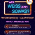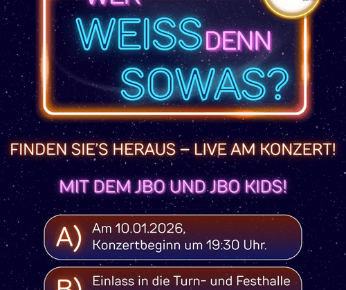 10.01.26 Jahreskonzert des MV Öhningen JBO Kids und JBO eröffnen um 19 Uhr in der Turn- und Festhalle Öhningen. Eintritt frei. Stuhlkonzert mit Snacks und Getränken, danach Barbetrieb. Das Motto „wer weiß denn sowas“ lädt zu einem Konzert voller Überraschungen ein: Freuen Sie sich auf bekannte Melodien, unerwartete musikalische Momente und kleine, charmante Wissensrätsel rund um die Stücke – ein Abend, der zum Mitraten, Staunen und Genießen einlädt.