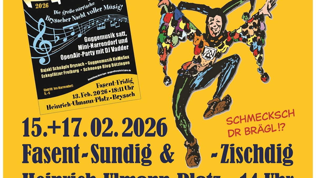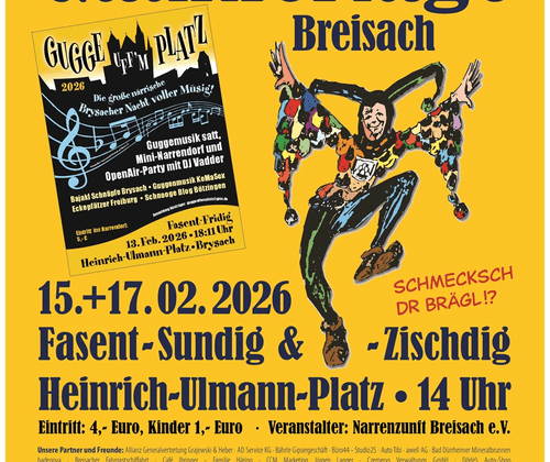 Historischen Gauklertage der Breisacher Narren, mit fröhlichem, bunten Programm mit Witz und dem Charme der typischen „Brisacher Fasent". Einmalig in der Alemannischen Fasnacht ist der Breisacher Gauklertag, der am Fasentssonntag und –Dienstag (15. + 17. Februar 2026) auf dem Heinrich-Ulmann-Platz ausgerichtet wird. ̲Er beruht auf einer historischen Begebenheit, und so gibt es in Breisach kein Prinzenpaar, sondern ein Kaiserpaar. Es handelt sich dabei um „Kaiser" Rudolf von Habsburg, mit seiner Gattin. Rudolf von Habsburg hielt sich im Jahre 1275 in Breisach auf und erteilte der Stadt ein neues Stadtrecht. Gleichzeitig erhielt Breisach von ihm die Privilegien zur Abhaltung von Gauklertagen. ̲Diese Privilegien werden nun alljährlich während der „Fasent" – wie es in Breisach heißt – vom Kaiserpaar feierlich bestätigt. ̲Zu Ehren des Schirmherrn wird auf dem Heinrich-Ulmann-Platz zu Anfang des Gauklertages ein feierlicher Einzug und ein historischer Teil aufgeführt, zu dem die traditionellen Dreyertanz und Gauklerreigen ebenso gehören wie der Tanz der Hochstetter Panduren und der Gardetanz der Kaiserhusaren. ̲Neben diesem historischen Teil bieten die Breisacher Narren ihrem Publikum ein fröhlich buntes Programm mit Witz und dem Charme der typischen „Brisacher Fasent". Auch eine Breisacher Besonderheit ist der Narrengruß. Er lautet „Schmecksch dr Brägel", worauf der Gegrüßte mit „Ajoo" antwortet.