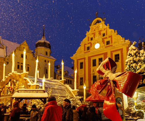 Am 24. November 2025 eröffnet der Gothaer Weihnachtsmarkt rund um das historische Rathaus in der Innenstadt seine Tore. Die offizielle Eröffnungsfeier mit Glühweinanstich und festlicher Musik findet um 18 Uhr statt. Die beiden großen Tannenbäume werden wieder wundervoll geschmückt sein und erstrahlen festlich im Zuge der Eröffnung.