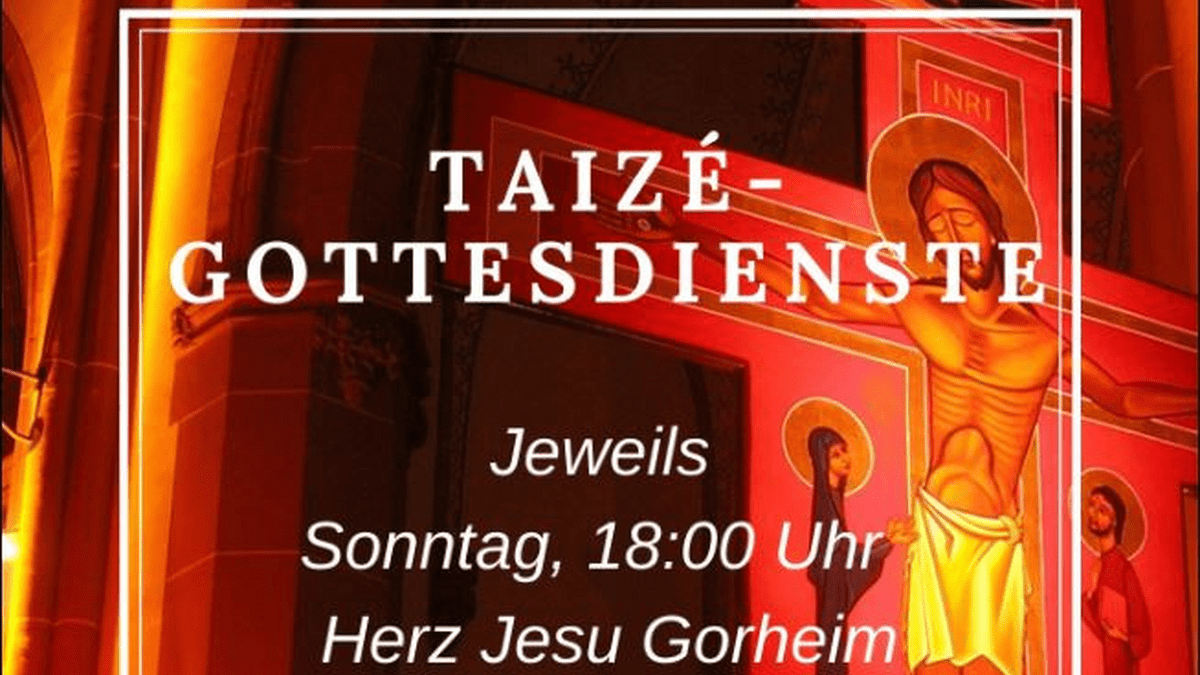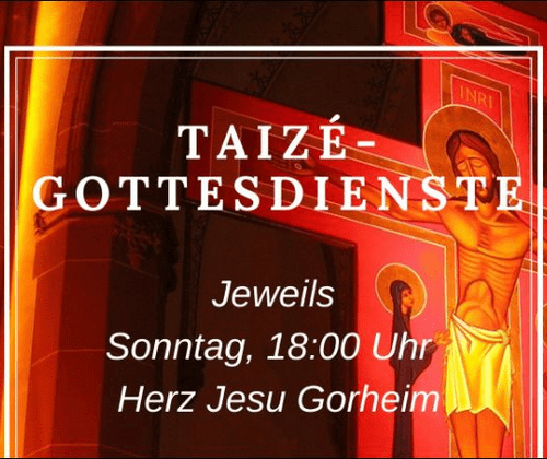 Taizé-Gottesdienst mit Kommunionfeier in Herz Jesu Gorheim Einladung zum Taizé-Gottesdienst am Sonntagabend um18:00 Uhr findet in Herz Jesu Gorheim ein Taizé-Gottesdienst statt, gestaltet mit Liedern aus Taizé und kurzen Impulsen. Die Besucher werden eingeladen, zur Ruhe zu kommen und Kraft zu schöpfen für die kommende Woche.