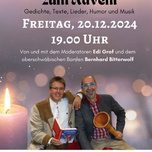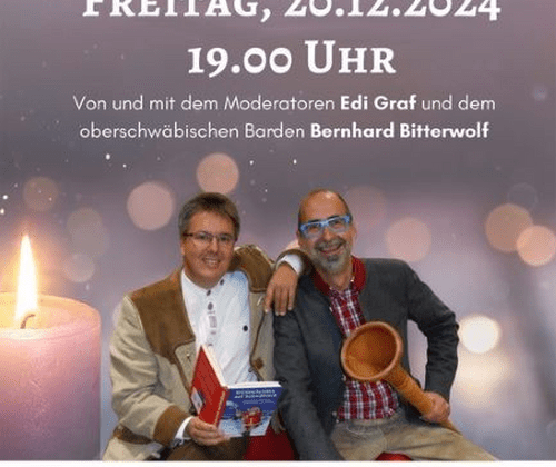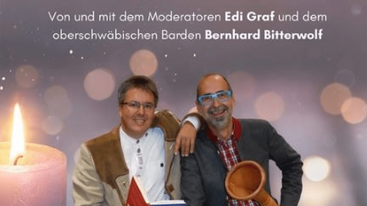 „Schwäbisches zum Advent“ Gschichtla, Gedichtle und Musig“ von und mit den Moderatoren Edi Graf und Bernhard „Barny“ Bitterwolf Die Adventszeit ist gerade in Oberschwaben die Zeit des Singens, Spielens, Vorlesens und Musizierens. Die überlieferten Texte der heimischen Adventslieder und Weihnachtserzählungen zeugen von einer tiefen und dennoch heiteren Volksfrömmigkeit. Der Autor Edi Graf aus Wurmlingen, und der oberschwäbische Barde Barny Bitterwolf aus Bad Waldsee nehmen ihr Publikum mit in eine typische stimmungsvolle Hohstube, wie sie früher in den Dörfern unserer Heimat gefeiert wurden. Freuen Sie sich auf eine vergnügliche und unterhaltsame Unterbrechung in der heutigen Zeit so üblichen Adventshektik.