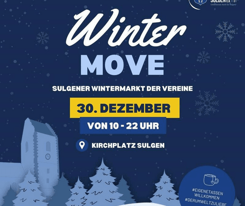 WinterMove Sulgen Nachdem vergangenes Jahr der erste "WinterMove" auf dem Sulgen stattgefunden hat und es einen überwältigende Anklang bei der Bevölkerung gefunden hat, wird im Jahr 2025 die zweite Auflage stattfinden. Freuen Sie sich auf das Angebot von den zahlreichen Vereinen, welche Mitglied im Vereinsring Sulgen sind. Programmpunkte, Musik, Essen & Trinken sowie einen Einblick in die alte St. Laurentiuskirche erwartet die Besucher des 2ten "WinterMove" auf dem Sulgen.