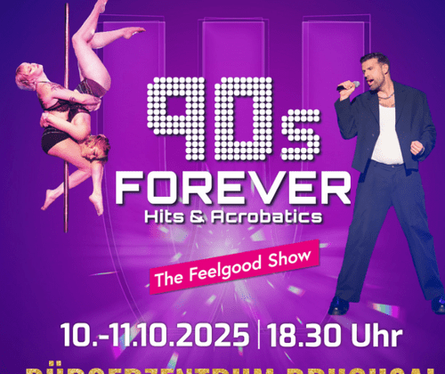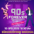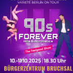 Das Wintergarten Varieté Berlin, Deutschlands ältestes Varieté, kommt nach dem überragende Erfolg der vergangenen Jahre zum dritten Mal nach Bruchsal und hat am 10. und 11. Oktober 2025 eine Show der Extraklasse im Gepäck - "90s Forever - Hits & Acrobatics" verbunden mit einem extravaganten 3-Gänge-Menü. Das Wintergarten Varieté Berlin, Deutschlands ältestes Varieté, kommt nach Bruchsal eine Show der Extraklasse im Gepäck - "90s Forever - Hits  & Acrobatics" Die Show ist eine hinreißende Hommage an das wohl schillerndste Jahrzehnt der Popkultur - schrill, süß, laut, schön und schnell wie die 90er selbst! Internationale Top-Artisten, eine furiose Live-Band und vier fantastische Sänger performen die größten Hits der 90er und lassen die unvergesslichen Sounds von Eurodance, Hip-Hop und Britpop wieder aufleben. Kraftvolle Onearmer, magisdche Sneakers, tanzende Bälle, glitzerende Hula Hoops und wirbelnde Rollerskates - bei dieser Show verschmelzen Musik und Körperkunst zu einer Einheit. Abgerundet wird dieses einmalige Showerlebnis durch ein exklusives "Show & Dine"-Angebot, das kulinarische Hochgenüsse und stilvolles Ambiente in Gala-Form vereint. Ein 3-Gänge-Menü erwartet die Gäste und läßt keine Wünsche für eine vollendete Varieté Atmosphäre offen. Genießen Sie eine Show für alle Sinne – seien Sie dabei, wenn die 90er zurück auf die Bühne kommen!  Tickets gibt es exklusiv bei der Touristinformation im “H7”, Hoheneggerstraße 7, 76646 Bruchsal, Tel. 07251 50594-61 oder online über unter www.reservix.de.