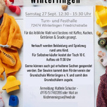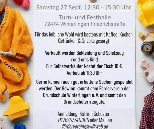 Verkauft werden Bekleidung und Spielzeug rund ums Kind. Für das leibliche Wohl ist bestens mit Kaffee, Kuchen, Getränken & Snacks gesorgt.  Für Selbstverkäufer kostet der Tisch 10 €, Aufbau ab 11.30 Uhr. Gerne können auch gut erhaltene Sachen gespendet werden. Der Gewinn kommt dem Förderverein der Grundschule Winterlingen e. V. und somit den Grundschülern zugute.