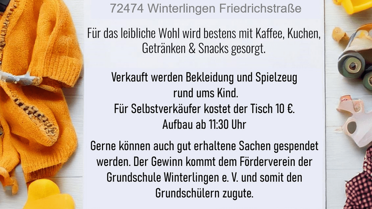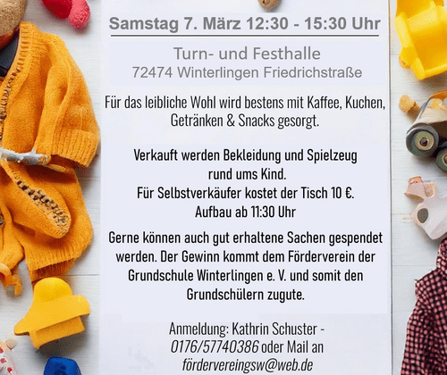 Verkauft werden Bekleidung und Spielzeug rund ums Kind. Für das leibliche Wohl ist bestens mit Kaffee, Kuchen, Getränken & Snacks gesorgt. Für Selbstverkäufer kostet der Tisch 10 €, Aufbau ab 11.30 Uhr. Gerne können auch gut erhaltene Sachen gespendet werden. Der Gewinn kommt dem Förderverein der Grundschule Winterlingen e. V. und somit den Grundschülern zugute.