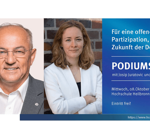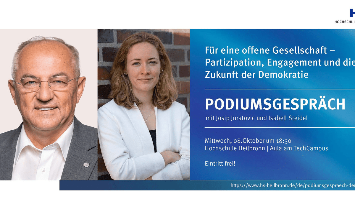 Gespräch an der Hochschule Heilbronn mit dem ehemaligen Bundestagsabgeordneten und Heilbronner Josip Juratovic und der Stadträtin Isabell Steidel über wehrhafte Demokratie und ihre aktuellen Herausforderungen sowie politisches Engagement im AlltagAnlässlich des 1. Demokratietags an der Hochschule Heilbronn findet das Gespräch "Für eine offene Gesellschaft: Partizipation, Engagement und die Zukunft der Demokratie" statt. Zu Gast sind der Heilbronner Politiker und ehemalige Bundestagsabgeordnete Josip Juratovic und die Stadträtin Isabell Steidel. Moderiert wird der Abend vom Haller Redakteur Tobias Würth. Wo: Aula am TechCampus der Hochschule Heilbronn Demokratie lebt vom Mitmachen und sie ist nie „fertig“, denn "wer in der Demokratie schläft, wird in der Dikatur aufwachen" (Josip Juratovic). Sie funktioniert nur so gut, wie wir alle sie im Alltag tragen und verteidigen. Gerade darum müssen wir fragen: Wo wird heute noch gestritten und der Kompromiss geübt? Wie können Bürger*innen Verantwortung übernehmen, statt nur Unmut zu äußern? Wann muss Demokratie wehrhaft sein und was bedeutet das konkret? Mit der Veranstaltungsreihe "Für eine offene Gesellschaft" bietet die Hochschule Heilbronn einen Raum, in dem aktuelle gesellschaftliche Themen besprochen werden und in dem für eine offene, vielfältige und gerechte Gesellschaft gestritten werden darf. Der Abend richtet sich an alle, die Lust auf die Debatte haben, denen die Demokratie am Herzen liegt und die gemeinsam positive Visionen entwickeln möchten. Barrierefreiheit: Bei dem Podiumsgespräch wird eine Signalübertragungsanlage vorhanden sein.