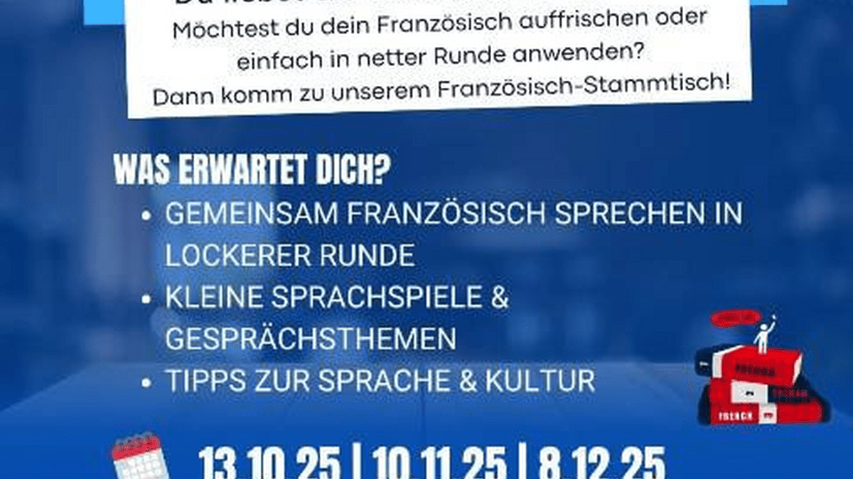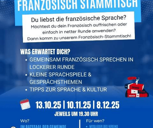 Französisch-Stammtisch Möchtest du dein Französisch auffrischen oder einfach in netter Runde anwenden? Dann komm zu unserem Französisch-Stammtisch! - Gemeinsam Französisch sprechen in lockerer Runde - Kleine Sprachspiele und Gesprächsthemen - Tipps zur Sprache und Kultur Für Mitglieder des Vereins. Interessierte und neue Gesichter sind herzlich willkommen!
