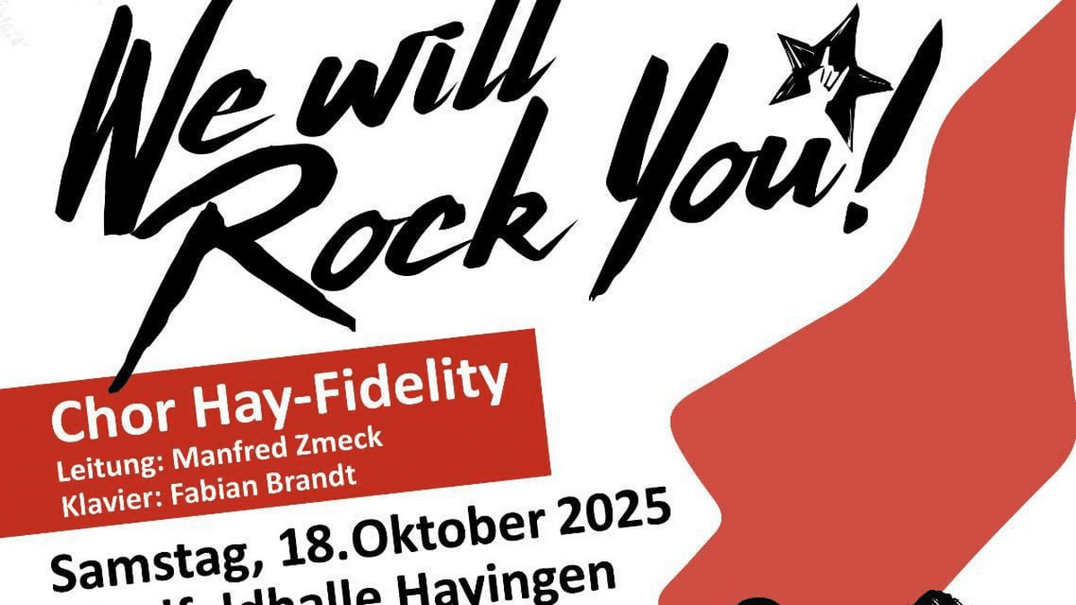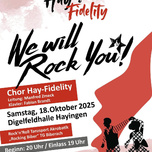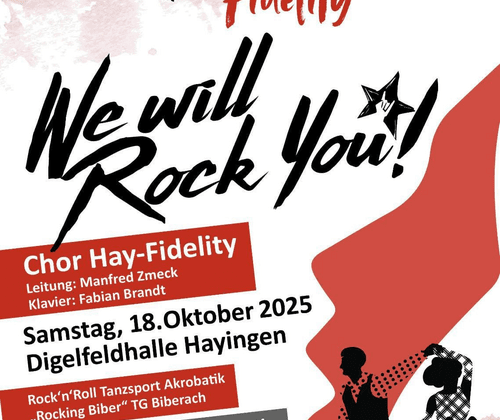 Der Chor Hay-Fidelity lädt herzlich zum diesjährigen Jahreskonzert ein. Unter dem Motto „We will rock you“ lässt der Chor die Bühne beben. Mit ihrem Dirigenten Manfred Zmeck haben die rund 45 Sängerinnen und Sänger ein vielfältiges Programm vorbereitet. Mitreißende Rock- und Pop-Arrangements, gefühlvolle Balladen, eindrucksvolle Solisten, aber auch ein eigens für den Chor zusammengestelltes Medley runden das musikalische Repertoire ab. Fabian Brandt wird den Chor dazu am Klavier begleiten. Freuen Sie sich auf einen musikalischen Abend mit deutschen und englischsprachigen Liedern, die jedem ins Ohr gehen. Mit einem tänzerischen Live-Act der Rock ‘n ´Roll Tanzsportgruppe „Rocking Biber“ hofft der Chor, ein abwechslungsreiches Programm und gute Unterhaltung unserem Publikum bieten zu können. Wie die Jahre zuvor wird in der Pause ein Häppchen-Büffet aufgebaut, bei dem Sie nach Herzenslust schlemmen dürfen (auf Spendenbasis).  Getränke und ein kleiner Snack stehen auch schon vor dem Konzert bereit. Nach dem Konzert werden Tische aufgestellt, damit Sie noch länger verweilen können. Der Chor Hay-Fidelity würde sich sehr freuen, wenn er Sie an diesem Abend in Hayingen begrüßen kann.