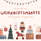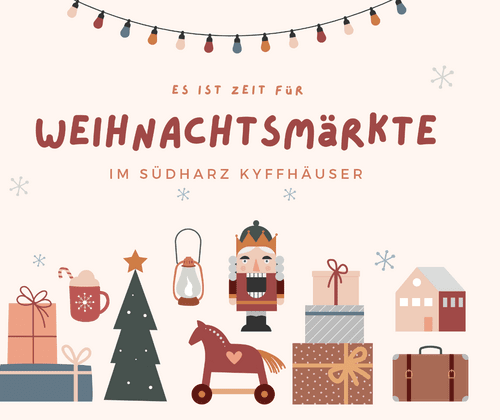 Auch in diesem Jahr laden wieder viele Advents- und Weihnachtsmärkte zu Besuch und Geselligkeit ein im Südharz Kyffhäuser: 14.12.-29.12.2024 29.11. – 22.12.2024 Weihnachtsmarkt in Nordhausen 19.12.-29.12.2024 Weiße Schlossweihnacht in Sondershausen 20.-22.12.2024 Advent im Turm - Schloss Allstedt - Fr. 16.00 bis 20.00 Uhr + Sa/So 14.00 - 20.00 Uhr 21.12.2024 Weihnachtsmarkt in Bottendorf Weihnachtsmarkt in Hachelbich - ab 15.00 Uhr Weihnachtsmarkt in Herrmannsacker – ab 14.30 Uhr Weihnachtsmarkt in Obergebra Glühweinfest in Winkel 22.12.2024 „Advent in den Höfen“ in Neustad/Harz - ab 12:00 Uhr
