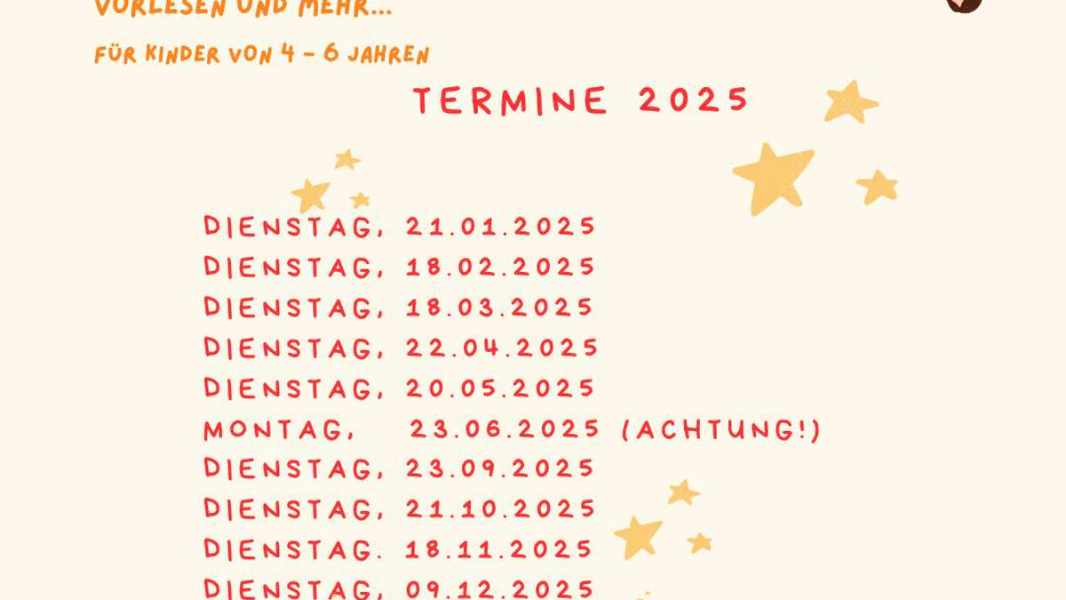 In der gemütlichen Atmosphäre der Stadtbücherei Lauterbach lesen wir Kindern zwischen vier und sechs Jahren aus Bilderbüchern vor. Häufig kommen dabei Bilderbuchkinos zum Einsatz. Nach dem Vorlesen werden die Inhalte der Bücher durch Mal-, Bastel- und andere Mitmachaktionen vertieft. Bitte melden Sie ihr Kind an. Das ist ab dem Montag der Vorwoche unter 06641 184162 möglich.
