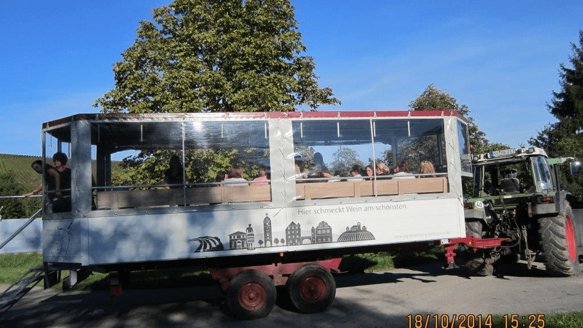Chic und bequem durch die Weinberge bei einer Planwagenfahrt mit dem Zabergäu-Bummler und moderierter Weinprobe. Fahren Sie bequem und wetterunabhängig durch Deutschlands größte Rotweinlandschaft, begleitet von 4 Weinen, Wasser, Traubensaft, Brot. Kurzweilig vermittelt gibt es Amüsantes, Interessantes und Wissenswertes über das Zabergäu, die Menschen die hier leben und natürlich über den Wein zu hören. Erleben Sie das Zabergäu von seiner genussvollsten Seite – ganz entspannt, bequem und unabhängig vom Wetter. Lehnen Sie sich zurück und lassen die einzigartige Weinregion an sich vorbeiziehen. Begleitet von einer sorgfältig ausgewählten Weinprobe mit vier regionalen Weinen und einem Secco, Wasser, Traubensaft, Fingerfood und Brot entdecken Sie die Vielfalt und den Charakter des Zabergäus. Jeder Wein erzählt seine eigene Geschichte und spiegelt die Landschaft, die Böden und die Leidenschaft der Winzerinnen und Winzer wider. Während der Fahrt erwartet Sie eine kurzweilige und unterhaltsame Moderation: Freuen Sie sich auf amüsante Anekdoten, spannende Hintergründe und wissenswerte Fakten rund um das Zabergäu, seine traditionsreiche Weinkultur und die Menschen, die diese Region prägen. Natürlich steht der Wein dabei im Mittelpunkt – von seiner Geschichte über den Anbau bis hin zu Besonderheiten der Rebsorten und Lagen. Diese Genussfahrt verbindet Information und Unterhaltung mit entspanntem Probieren und Staunen. Ideal für Weinliebhaber, Genießer und alle, die das Zabergäu auf komfortable und genussvolle Weise kennenlernen möchten – ganz ohne Wanderschuhe, aber mit umso mehr Geschmack. Ein Erlebnis für alle Sinne, das lange in Erinnerung bleibt. ### Inkludierte Leistungen - Führung - 4er Weinprobe - 1 Secco - Fingerfood - Wasser - Brot ### Sonstiges - ab 2 Stunden - Mindestteilnehmer: 15 - Maximalteilnehmer: 24 - Auch buchbar als "Sunset-Moonrise-Tour" Fahrt in den Sonnenuntergang Weinerlebnisführerin & Weindozentin Regine Sommerfeld Tel. 07135 5974 oder 0174 6056500 regine.sommerfeld@t-online.de Weitere Angebote unter: www.zaberguides.de