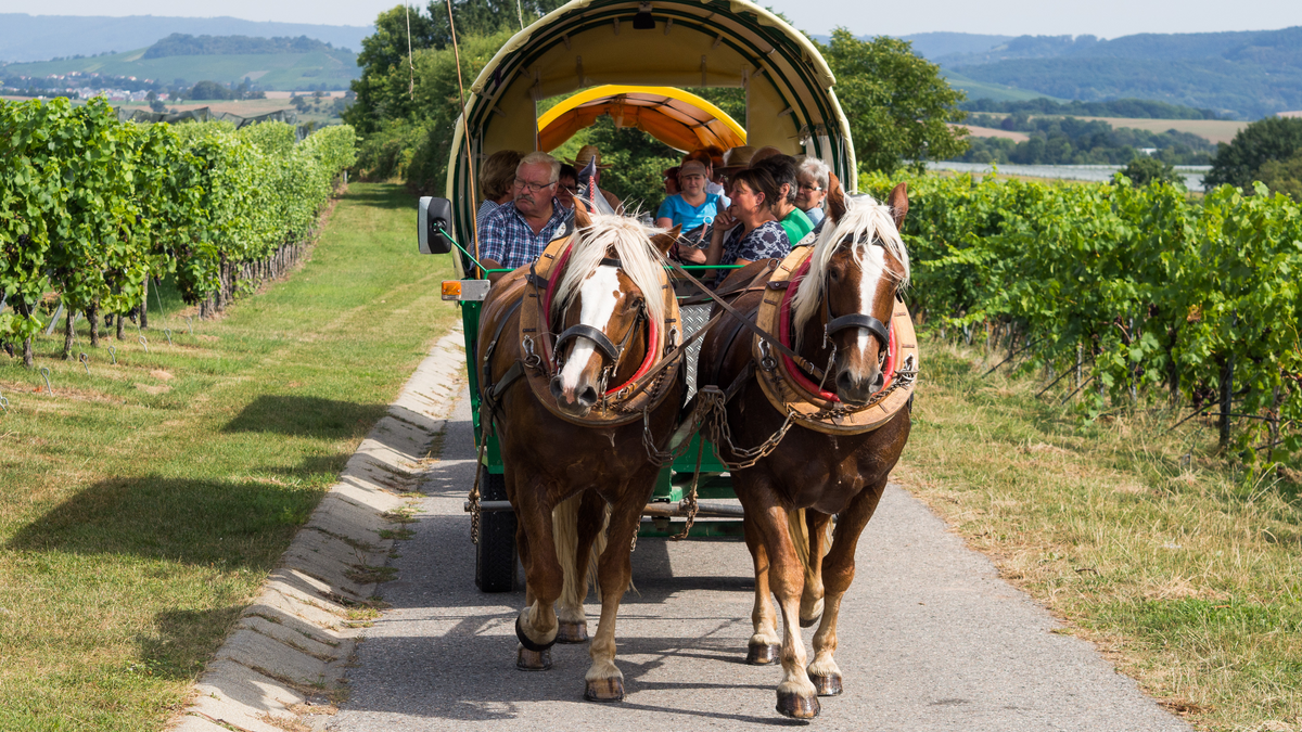 Das einzigartige Erlebnis: Weinselige Fahrt mit dem Pferdeplanwagen. Dax und Schliri, die beiden braven süddeutschen Kaltblüter schaffen auch die steilsten Wengertsbuckel, während Sie ganz entspannt herrliche Aussichten und himmlische Weine genießen dürfen. Ein Weinvergnügen ganz besonderer Art. **Leistungen**: - Secco Gina als Starter - geführte Weinerlebnistour mit dem Pferdeplanwagen (ca. 3,5 Std.) - Weinverkostungen mit Leckereien und andere Versuchungen - Mineralwasser und Traubensaft  - Überraschungen und kurzweilige Unterhaltung. Auf Wunsch wird die Tour auch in englischer Sprache angeboten. Im [Weinshop oder als Gutschein](https://www.weingut-weihbrecht.de/weinshop/gutscheine-geschenke/gutschein-mit-2-ps-durchs-himmelreich) erhältlich. Die Tour ist nach Bezahlung verbindlich gebucht. Bring gute Laune und Lust mit, etwas zu erleben, ggf. wetterfeste Kleidung. Buchbar von März bis November. Auch für ältere Menschen geeignet, die schlecht zu Fuß sind. Anschließend besteht die Möglichkeit zur Einkehr in der Besenwirtschaft.