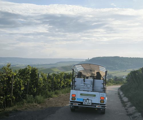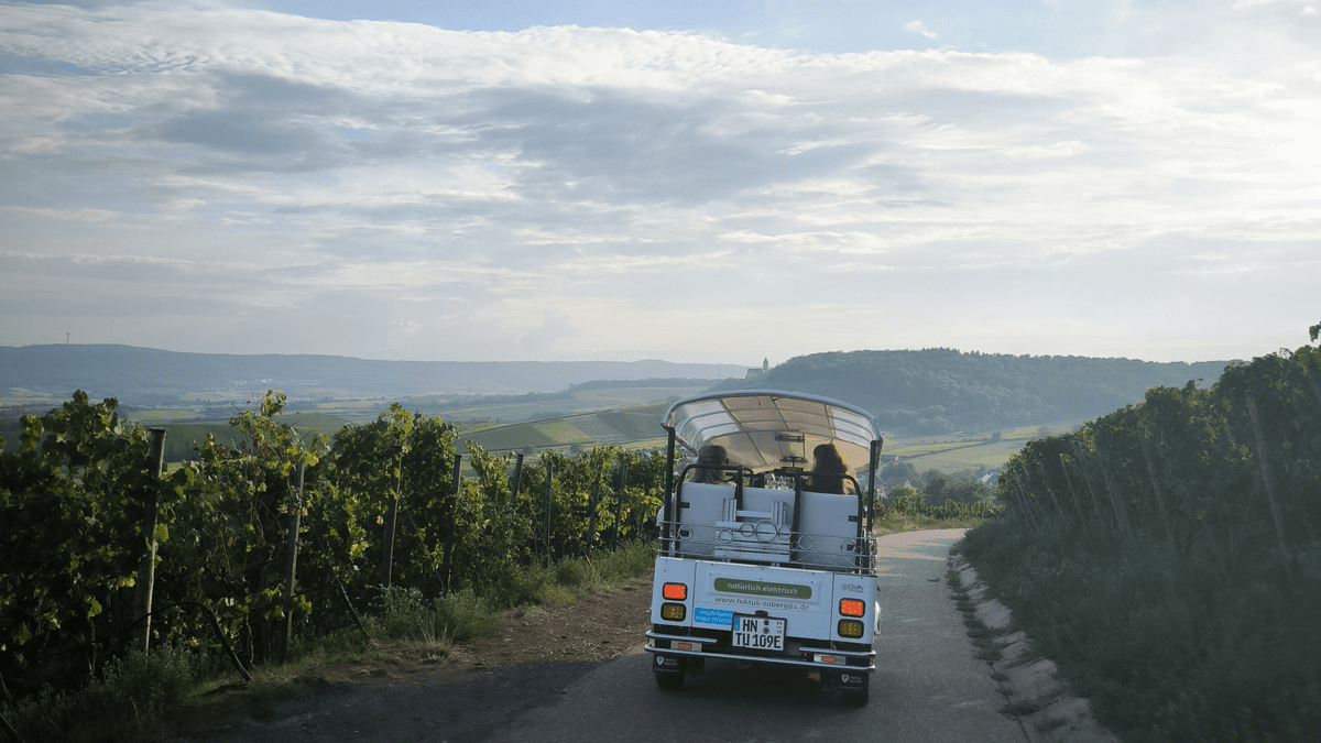 Mit dem E-TukTuk durch die bekannten Brackenheimer Weinlagen - inklusive Weinprobe. Einsteigen und genießen. Mit dem E-Tuk Tuk geht es gemütlich durch die Weinberge. Fahren Sie emissionsfrei und fast lautlos mit den elektrischen Liebhaber-Fahrzeugen über den Heuchelberg. Vorbei an gepflegten Rebhängen, führt über Fahrt über den Mönchsberg, den Zweifelberg und über den Wolfsaugen. Die bekannten Einzellagen bürgen für qualitativ hochwertige Weine, die natürlich unterwegs auch verkostet werden. Vorbei an den bekannten Weinorten Haberschlacht, Stockheim, Neipperg und Brackenheim geht es in beschaulichem Tempo durch das Zabergäu. Tourbeispiele Tuk-Tuk-WeinErlebnis Gemütlich geht es durch Deutschlands größte Rotweinlandschaft im Bereich Heuchelberg & Zweifelberg. Dazu Amüsantes, Interessantes und Wissenswertes zum Wein und zur Region. Leistungen: Fahrt mit dem E-Tuk-Tuk Führung durch Weinerlebnisführerin & Weindozentin 1 Secco & 2 Weine Wasser und Brot Tuk-Tuk-WeinErlebnis - die "Große Runde" Fahrt mit Halt an herrlichen Aussichtspunkten, begleitet von leckeren Weinen und Fingerfood. Amüsantes, Interessantes und Wissenswertes zum Wein und zur Region sind inklusive. Leistungen: Fahrt mit dem E-Tuk-Tuk Führung durch Weinerlebnisführerin & Weindozentin 4 Weine Fingerfood Mindestteilnehmer: 4 Personen Wissenswertes zu den E-Tuk-Tuks Inklusive Fahrer finden 5 Personen bequem Platz in den Fahrzeugen; bei größeren Gruppen wird ein Tuk Tuk von der Weinerlebnisführerin gesteuert, für die weiteren Fahrzeuge Fahrer aus der Gruppe 3 Fahrzeuge sind gleichzeitig buchbar; maximale Gruppengröße 14 Personen Buchbar als Weinerlebnis-, Stadt- oder Kombitour; individuelle Touren und Mietdauer sind möglich buchbar ab 2 Stunden Alle Informationen zu den Fahrzeugen unter: www.tuktuk-zabergaeu.de