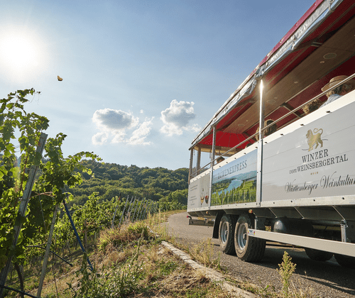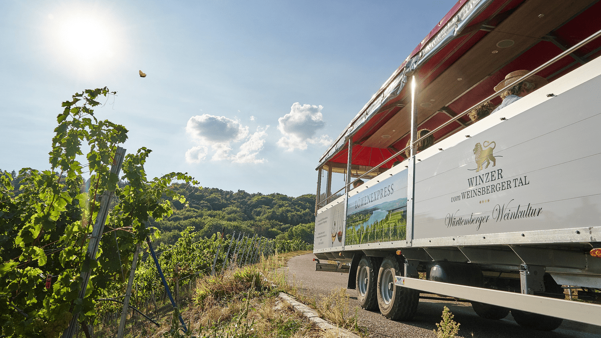 Weinbergrundfahrt durch die Weinlandschaft im Naturpark Schwäbisch-Fränkischer Wald. Weinerlebnistour mit 4er Weinprobe und traumhaften Aus- und Weitblicken. Startpunkte je nach Termin in Eberstadt oder Löwenstein.  In den Löwen-Express einsteigen und sich bei einer 2 bis 2,5-stündigen Fahrt durch die Weinberge kutschieren lassen.  Je nach Termin rund um den Weinsüden Weinort Löwenstein oberhalb vom Breitenauer See oder rund um Eberstadt. Ein Winzer erläutert dabei Interessantes rund um den Weinbau links und rechts des Weges. Geschichte und Geschichten zu Land und Leuten und den Schönheiten der Region kommen natürlich auch nicht zu kurz. Leistungen Fahrt mit dem Löwen-Express durch den Weinberg4er Weinprobe mit Weinen der Winzer vom Weinsberger TalSprudel und TraubensaftBrot und Hefezopf Weitere Hinweise Dauer: 2-2,5 StundenTreffpunkt je nach Termin am Weinhaus Eberstadt oder am Weinhaus Löwenstein.Weinhaus Eberstadt | Lennacher Straße 25, 74246 EberstadtWeinhaus Löwenstein | Reisacher Str. 5, 74245 Löwenstein Löwen-Express - das Gefährt Der Löwen-Express ist ein komfortabel eingerichteter Planwagen für bis zu 22 Personen. Durch die erhobene Position gleitet man erhaben durch die Weinberge - ein Blick von oben auf´s Rebenmeer.