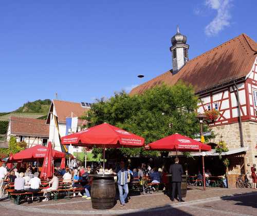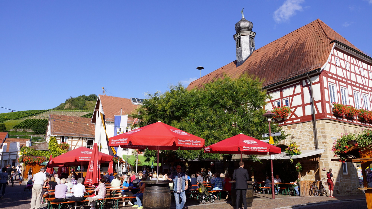 Original Erlenbacher Weinfest - gesellig und unterhaltsam rund um den Marktplatz der Weinbaugemeinde Erlenbach. Jährlich im August findet in Erlenbach bei Heilbronn das „Original Erlenbacher Weinfest“ statt. Eines der traditionsreichsten Weinfeste in Württemberg. Gefeiert wird von Freitag bis Montag rund ums Erlenbacher Rathaus zwischen charmanten Fachwerkhäuser und historischen Gassen. Bei zünftiger Blasmusik - tagsüber gesellig und abends fetzig - kommt eine ganz besondere Stimmung auf. Programm zum Erlenbacher Weinfest Über zwei Bühnen und weitere Plätze verteilt, bietet sich ein breites Programm, das sowohl für Jung als auch für Alt geeignet ist: Buttenlauf Kinder & Vereine | Samstag Besuch der Württemberger Weinkönigin | Samstagnachmittag „Traubenkinderprogramm“ | Sonntag 13-17 Uhr großartige Unterhaltung für kleine Gäste mit Basteln & Schminken „Seniorennachmittag“ | Montag mit vergünstigten Preisen Wahl der Zwiebelkönigin | späten Montagabend Mit traditioneller Krone aus Petersilie und Zwiebeln und einem dazu passenden Zepter wird sie in ihre Amtszeit bis zum nächsten Weinfest ein Jahr später verabschiedet. s`Besondere | Zwiebel- & Peterlingkuchen Dem leiblichen Wohl dienen 120 Backfrauen in historischen Backhäusern. Die Zwiebel- und Peterlingkuchen gelten als Publikumsmagnet. Traditionell wird das alte Backhaus mit Rebenholz angeheizt. Dies verleiht den Kuchen den besonderen Geschmack. Weine & Weingüter An 10 Weinprobierständen können über 150 verschiedene Weine vom Kayberg und am Sektstand 14 Winzersekte verkostet werden. Anreise & Parken direkt am Württemberger Weinradweg nahe dem Autobahndreieck Weinsberg A6/A81, von der A81 Ausfahrt 10 Weinsberg ca. 10 min/7 km PKW-Parkplätze entlang der Talstraße | Bereich Sulmtalhalle Busparkplätze an der L1101/Käppelesäcker Weinsüden Weinort Erlenbach Mit 245 Hektar Weinanbaufläche gehört Erlenbach zu den größten Weinbaugemeinden in Baden-Württemberg. Da darf ein zünftiges Weinfest nicht fehlen. Bereits über 40 Mal fand das Original Erlenbacher Weinfest bisher statt. Der romantische Weinort liegt am Fuße des Kaybergs und bietet mit seinen malerischen Fachwerkhäusern und Gassen eine tolle Kulisse für das viertägige Fest. Gastgeber für Weinfreunde in der Nähe vom Erlenbacher Weinfest Weinpension Haberkern Hotel-Restaurant Rebstock Wohnmobilstellplätze Weingut Schönbrunn Wohnmobilstellplätze Genossenschaftskellerei Heilbronn