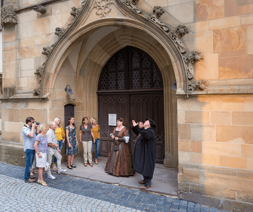 Szenische Erlebnisführung zur Reformation in Bad Wimpfen. Die historische Kaiserpfalz ist Originalschauplatz und Kulisse. Inkl. HNV-Ticket. Wie der Ablassbrief ins Fegefeuer kam | Reformationsführung Be diesem szenischen Stadtrundgang stehen die die Wirren, Konflikte und Turbulenzen der Reformationszeit im Mittelpunkt. Die neue Religion spaltete die Bürgerschaft in der Reichsstadt Wimpfen. Der Streit um die Nutzung der evangelischen Kirche, einst Marienkirche, eskalierte, nach dem sich Papst und Bischof eingemischt hatten. Die geschichtlichen Ereignisse werden zum Teil am Ort der Geschehnisse in der historischen Altstadt und Kaiserpfalz Bad Wimpfen erzählt. Unterhaltsam gestaltet wird die szenische Stadtführung von zwei historisch gewandeten Gästeführern. Inkludierte Leistungen szenische Erlebnisführung mit einem Gästeführer und einer Gästeführerin im historischen Gewand inkl. ÖPNV-Ticket für das regionale Streckennetz Weitere Hinweise Dauer ca. 1,5 h Beginn der Führung am Bahnhof Bad Wimpfen max. Teilnehmerzahl 25 Personen Ermäßigung mit Gästekarten Bad Rappenau/Bad Wimpfen Tickets online buchen bewegt-Plus Partner: bei Vorlage eines tagesaktuellen bwtarif-Tickets erhalten Sie eine Vergünstigung Sonstiges Für Gruppen auch zum Wunschtermin ganzjährig individuell buchbar Tipp - kostenlose Anreise mit dem ÖPNV Bei Vorausbuchung der öffentlichen Stadtführung ist im Ticket die An- und Abreise mit dem ÖPNV im gesamten Streckennetz des HNV inklusive.