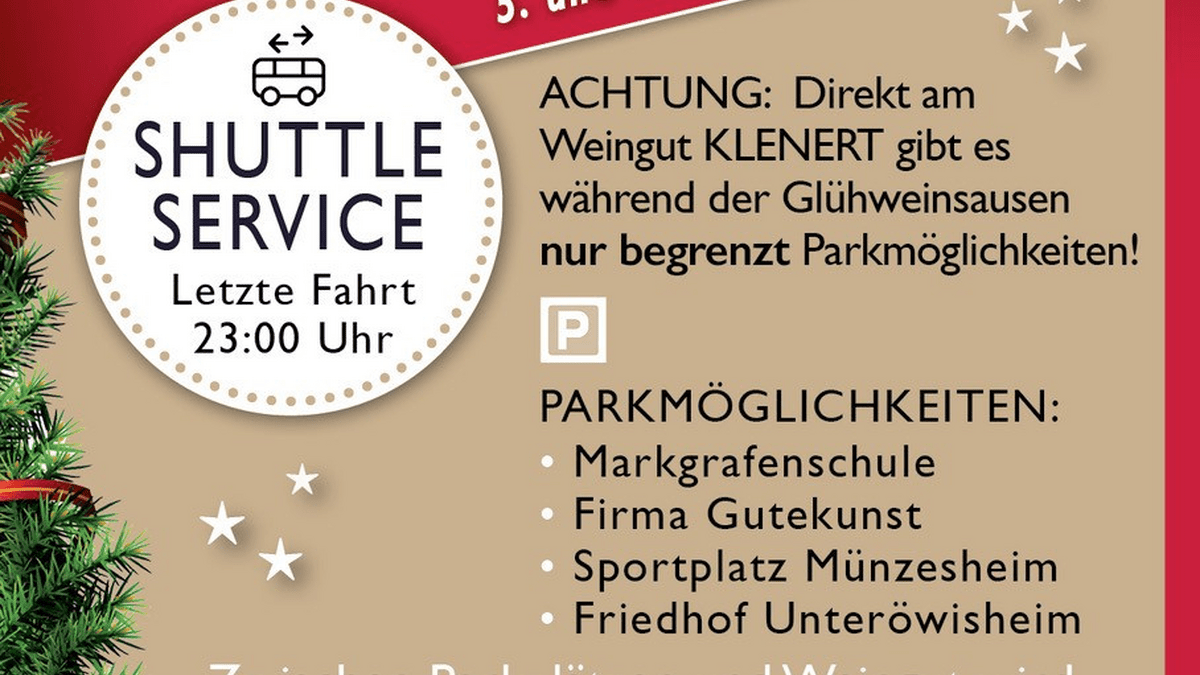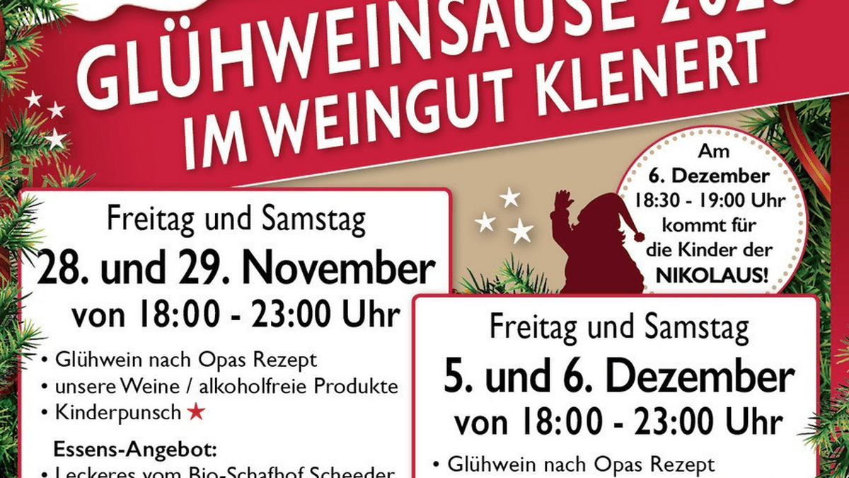 Unsere jährliche Glühweinsause wartet an vier Abenden auf Dich! Genieße ehrlichen Winzer-Glühwein nach Opas Rezept bei uns auf dem Weingut. In stimmungsvoller, weihnachtlicher Atmosphäre könnt Ihr Euch bei uns auf die Weihnachtszeit einstimmen. - Am Samstag, 29.11.2025 Live-Musik mit der Polka-Blaskapelle Cocky Bricha! - Am Freitag, 05.12.2025 Live-Musik mit der Big Band Bajazzo! - Am Samstag, 06.12.2025 18:30 - 19:00 Uhr kommt für die Kinder der Nikolaus und hat kleine Überraschungen im Sack dabei. Genieße nachhaltig produzierte Weine und die dazu passenden regionalen Speisen. Wir bieten Leckeres vom Bio-Schafhof Scheeder, Chili sin Carne etc. Außerdem wird es Waffeln und Kinderpunsch geben. Unser Weingut erstrahlt im Innen- und Außenbereich in schöner, weihnachtlichen Atmosphäre. Egal ob ihr "Weihnachtsmarkt-Feeling" mit heißem Glühwein an beleuchteten Stehtischen genießen wollt, oder ob ihr es euch gerne in unseren gut beheizten Innenräumen gemütlich machen wollt, für jeden Geschmack haben wir etwas vorbereitet. Wir freuen uns auf genussvolle Begegnungen!