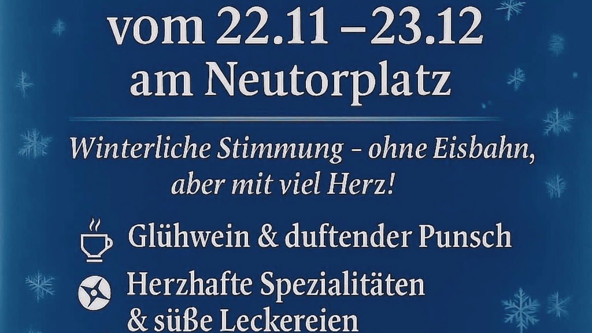 Kleiner Weihnachtsmarkt mit Ständen zum Essen und Trinken. Vom 22.11.-23.12.2025 findet auf dem Neutorplatz der kleine, aber feine Adventstreff und Weihnachtsmarkt mit Ständen zum Essen und Trinken statt. Samstags wird es Live Musik geben. Für Kinder wird ein Karussell aufgebaut. Der Adventreff ist nur 5 Minuten vom Bahnhof entfernt, was eine Anreise mit öffentlichen Verkehrsmitteln erleichtert. Öffnungszeiten: Mo, Mi, Do und Fr.:16:00 - 21:00 Uhr Di (zeitweise mit Markt): 14:00 - 21:00 Uhr Sa + So: 13:00 - 21:00 Uhr **Veranstaltungen:** *Freitag, 05.12.2025* COCKTAIL* 18:30 - 21:00* *Samstag, 06.12.2025* HOME OF DANCE – FEES BALETT­SCHULE KINDERCHOR THERESIANUM* *Samstag, 13.12.2025* BLISSLINE 18:30 - 21:00                                                                            Sonntag, 14.12.20                                                                                    STADTMUSIKVEREIN BREISACH      *Freitag, 19.12.2025* COMBO RIMSINGEN* *Samstag, 20.12.2025* AUßER RAND UND BäND 18:30 - 21:00* *Dienstag, 23.12.2025* COCKTAIL 18:30 - 21:00 Mehr Informationen finden Sie hier: [https://adventstreff-breisach.de/](https://adventstreff-breisach....)